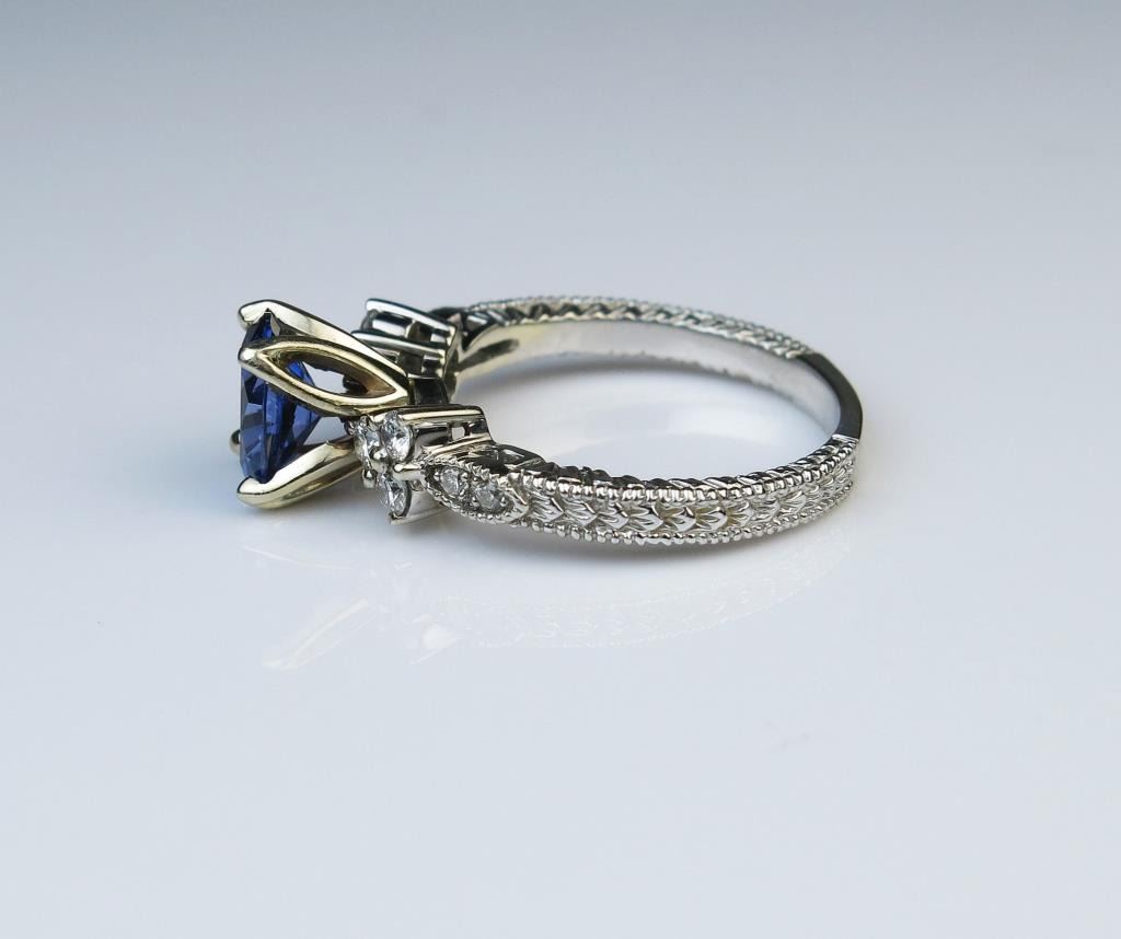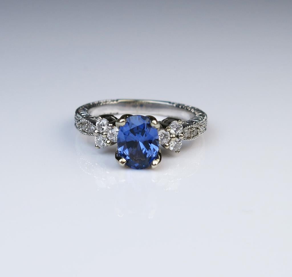 Finely detailed styling featuring an oval cut Tanzanite weighing approx. 1.50 carats with rich violet blue color and VS clarity accented with 10 'IDEAL' cut Diamonds weighing approx. 0.50 carats of G-H colors and VS/SI clarity set in 14 karat white gold