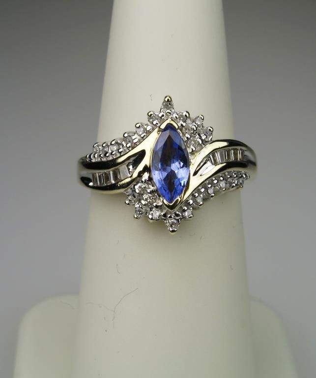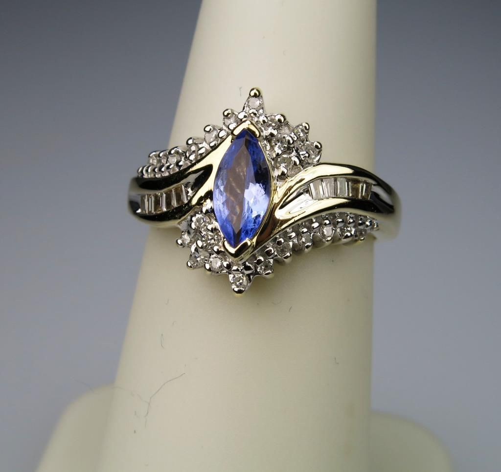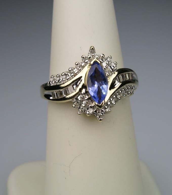 Elegant Tanzanite and Diamond Ring with marquise cut Tanzanite weighing approx. 0.80 carats with 34 round and baguette cut Diamonds weighing approx. 0.60 carats with G-H colors and SI clarity set in 14 karat yellow gold. Retail $1,000-$1,500Estimate $600-$900