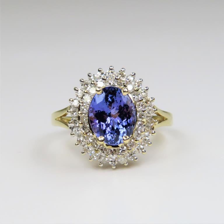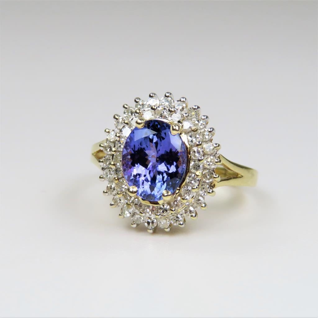 featuring an oval Tanzanite weighing approx. 2.00 carats accented with a double frame of 46 round Diamonds weighing approx. 1.00 carats with H-I colors and SI colors set in 10 karat combination yellow and white gold. Retail $3,000-$4,000