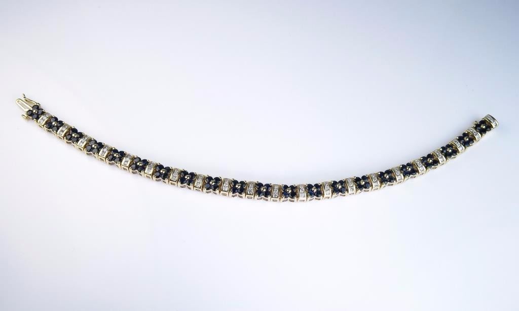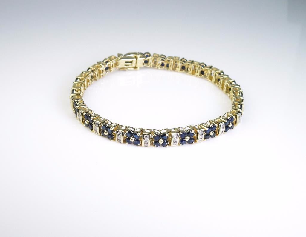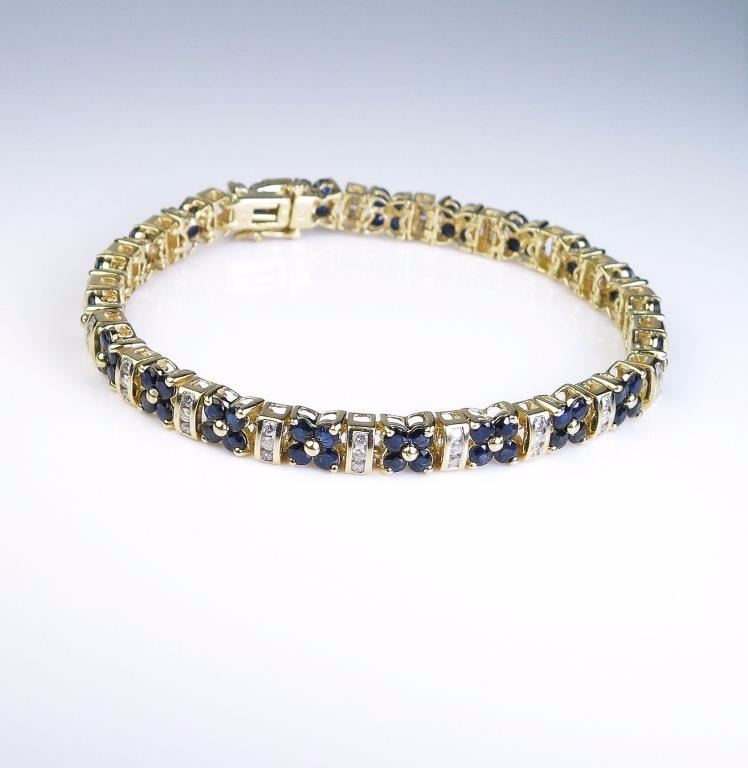 Elegant ladies Sapphire and Diamond Bracelet set with 84 round sapphires weighing approx. 4.00 carats channel set with over 63 round diamonds weighing approx. 1.00 carat of G-H colors set in heavy 14 karat yellow gold.Retail $3,000-$4,000 Estimates $1,500-$2,000