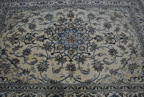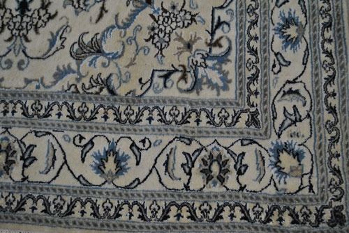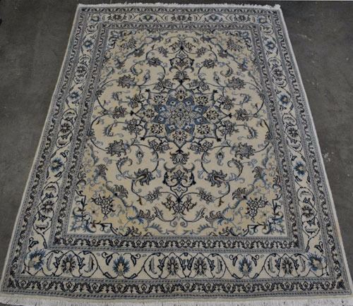 Elegant regal shah abbasi design Persian Nain-Isfahan. Made of fine quality baby lamb and wool-part pure silk pile on cotton foundation, all natural vegetable dye, incorporating the elegant and regal shah abbasi floral pattern on a cream colored background; teardrop centerpiece medallion; finely done crowned corners and finished off beautifully with an intricately done floral trim. The silk highlights of this phenomenal hand woven Persian Nain gives this rug an extra level of beauty and esthetic appeal. Size: 8 feet X 5 feet 4 inches. Country of origin: Iran.