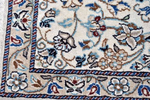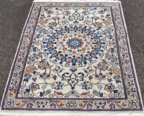Elegant regal shah abbasi design Persian Nain-Isfahan. Made of fine quality lamb's wool pile on cotton foundation, all natural vegetable dye, incorporating an elegantly done shah abbasi floral pattern on a beautiful background sunburst centerpiece medallion, finely done crowned corners and an intricately done floral border. please note that this design pattern is only able to be done by the most skilled of carpet weavers. From Nain, Iran. Dimensions for Rug from top to bottom: height 57 X width 36 inches. Size: 4 feet 7 inches X 3 feet. Country of Origin: Iran.