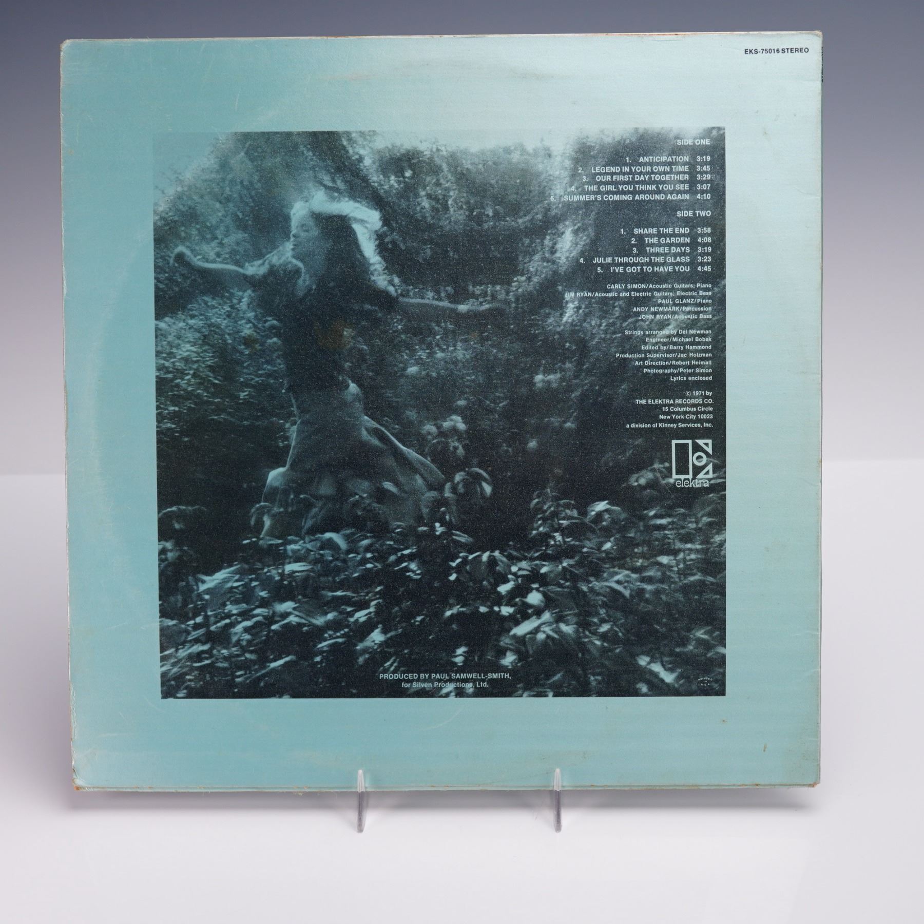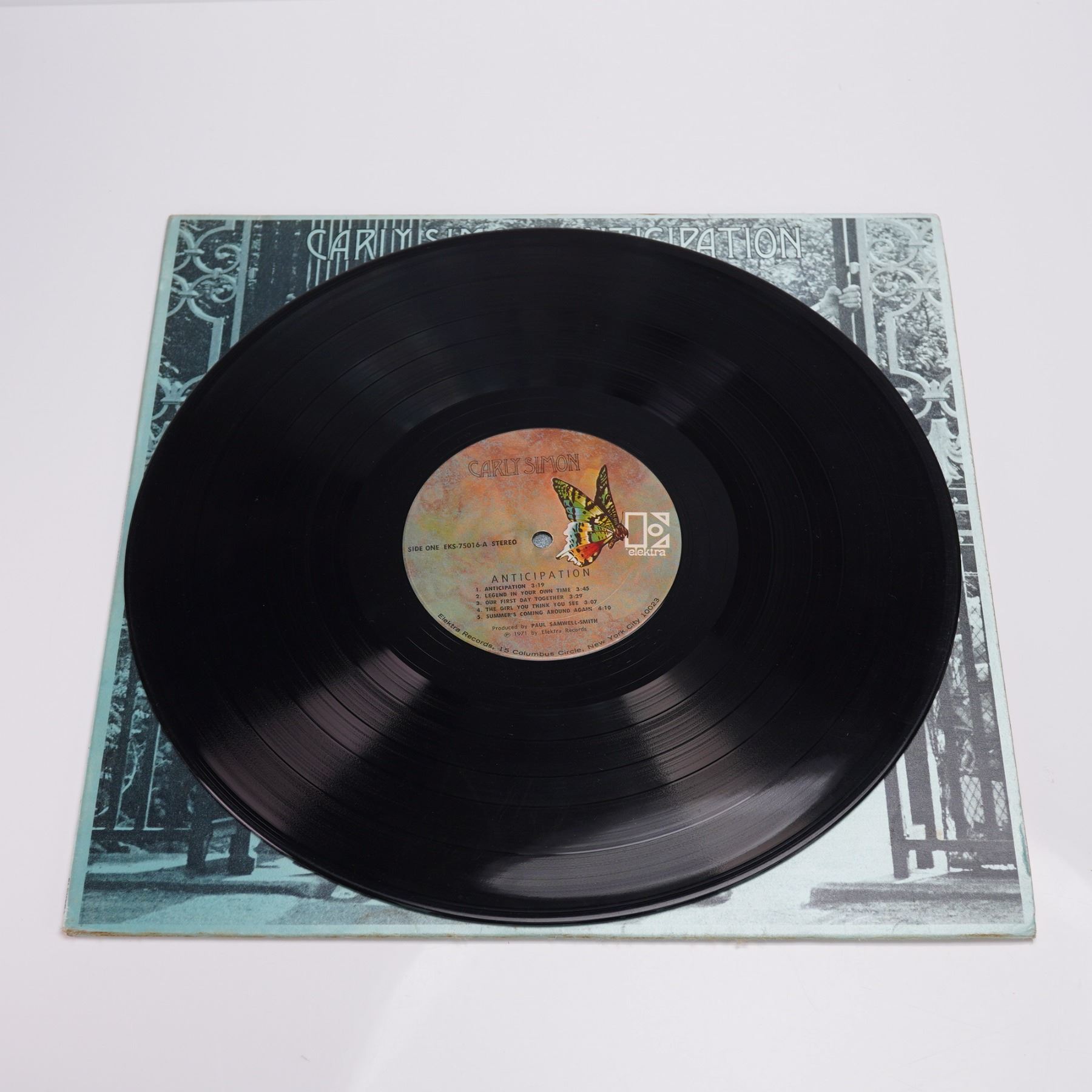 A 1971 U.S. pressing of Carly Simon's "Anticipation" LP vinyl album, issued by Elektra Records. The front cover presents a stylized monochromatic photograph of the artist gracefully poised between wrought iron gates, capturing the contemplative and introspective mood of the album. The reverse features a soft-focus forest setting surrounding a track list of original compositions. Produced by Paul Samwell-Smith, this album includes the notable title track "Anticipation," along with songs like "Legend in Your Own Time" and "Julie Through the Glass." The vinyl itself is pressed on the Elektra butterfly label.
