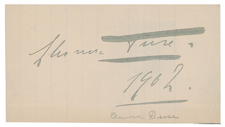Italian actress (1858–1924), contemporary of Bernhardt. Vintage ink signature, “Eleonora Duse, 1902,” on an off-white 4.75 x 2.5 lightly-lined slip. In fine condition, with light, intersecting folds, one vertical fold through a single letter of the signature, and a collector’s notation underneath the signature.