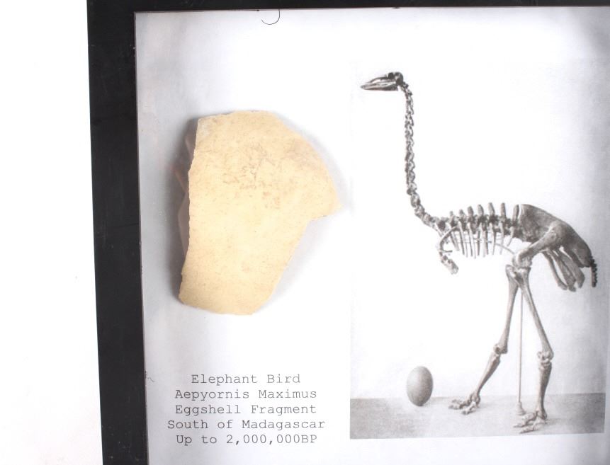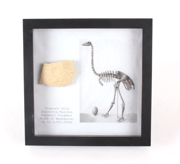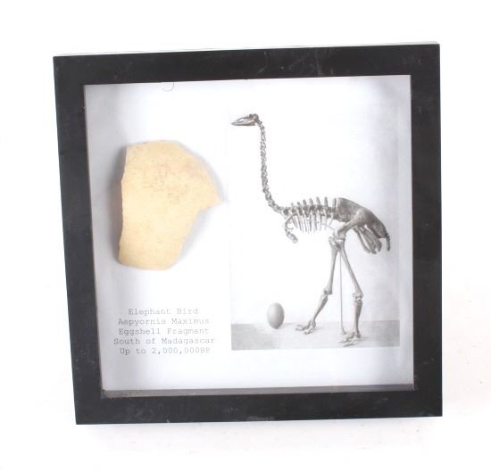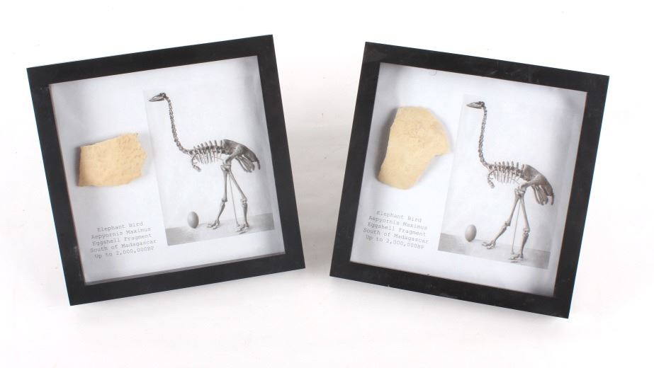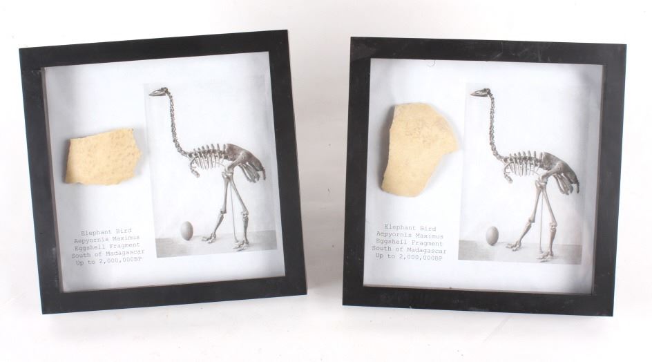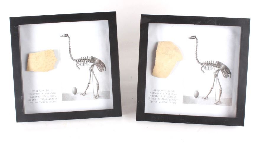 Featured in this lot we have a pair of Elephant bird eggshell fossil fragments. The ancient fossil fragment originate from Madagascar. The fragments are both framed with a picture of a elephant bird skeleton. The elephant bird or Aepyornis Maximus lived in pre-historic ancient times. Both fragments where found south of Madagascar. The overall condition of the two pieces is good their ages. Both frames measures 9" wide by 9" tall by 1 1/4" deep.