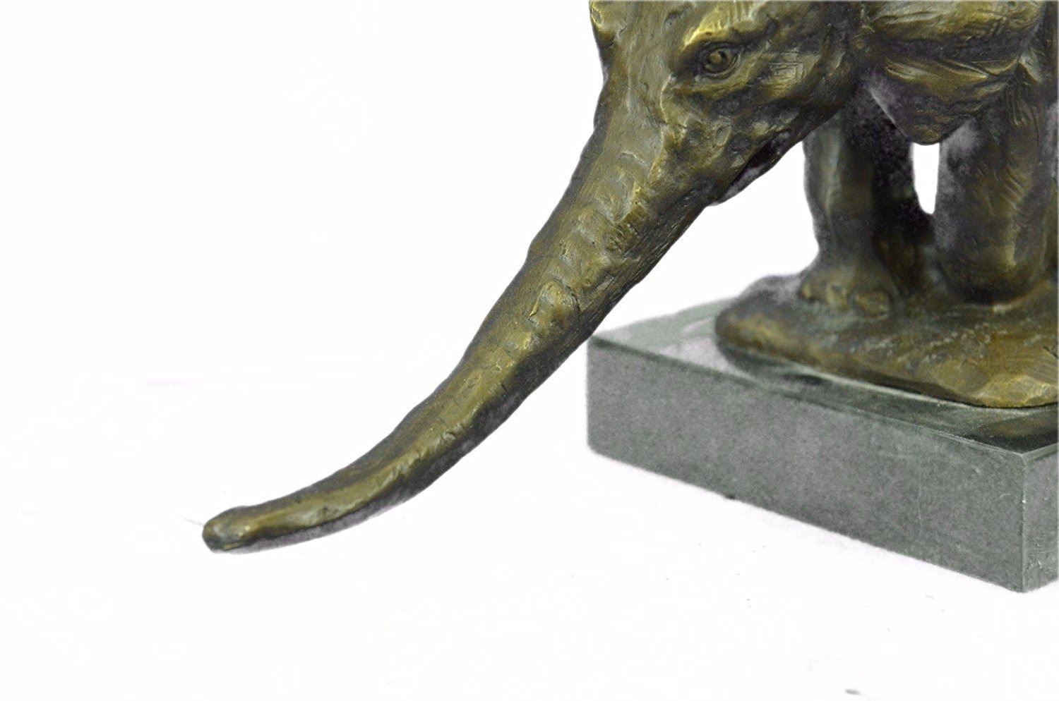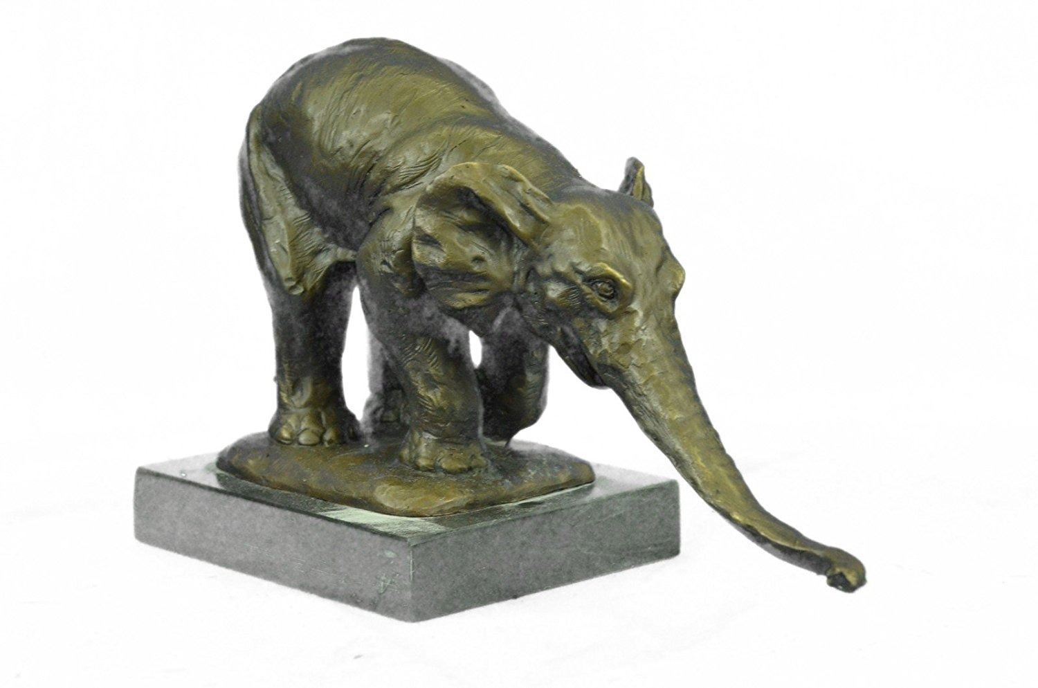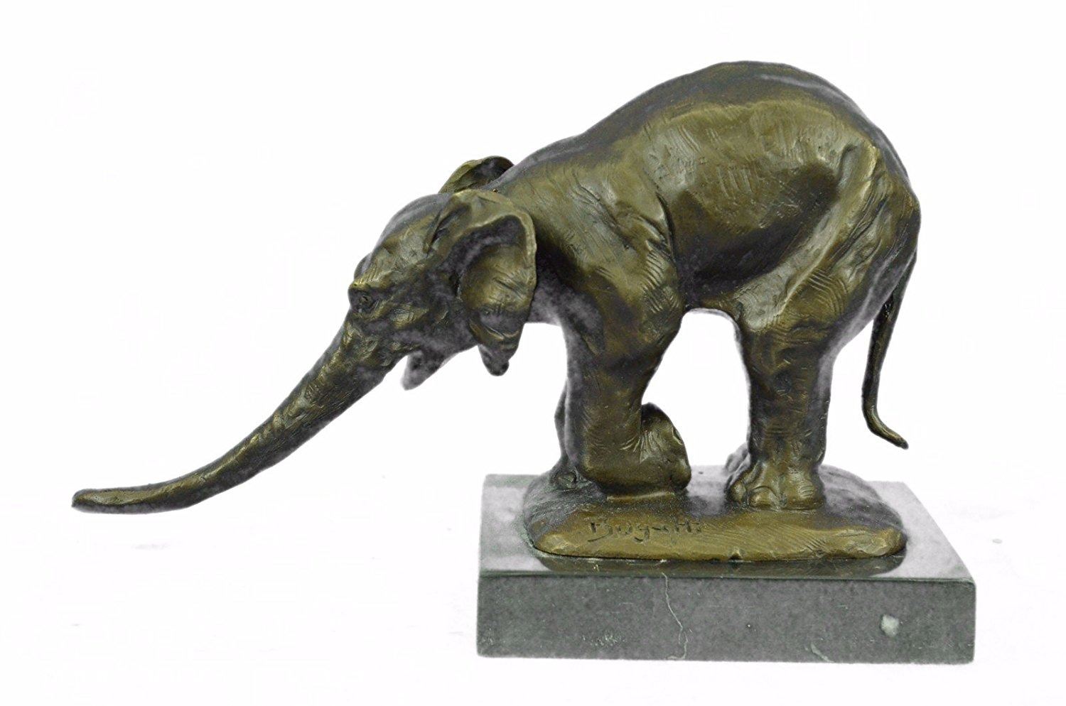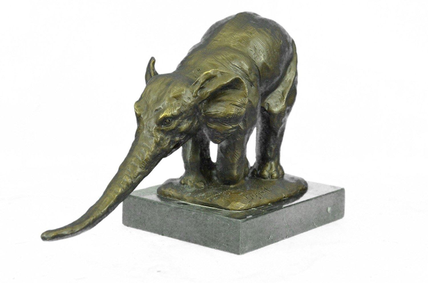 This happy elephant lets out a loud long shriek as she playfully walks across the dry dusty plains of the land. Although she is a very large size animal she is as agile and light on her feet. She bends her front leg as she walks and extends her trunk as far as it goes and continues to shriek. Her ears are flap back and forth as she gets rid of the flies. . Her tail hangs behind her and her eyes are wide. This is a beautiful sculpture depicting a happy elephant in her natural environment. If you look closely you can see the creases and texture of the skin. This bronze sculpture was cast using the Lost Wax Method and has a brown patina and is mounted on a gorgeous marble base. Bronze Dimensions with Marble Base: Height 8 X Width 12 inches. Weight: 10 LBS. Inventory: 2943K16192