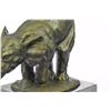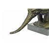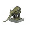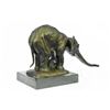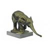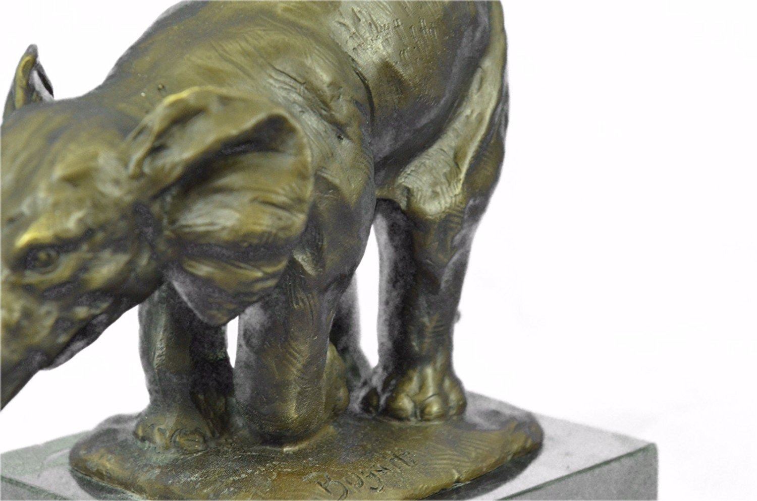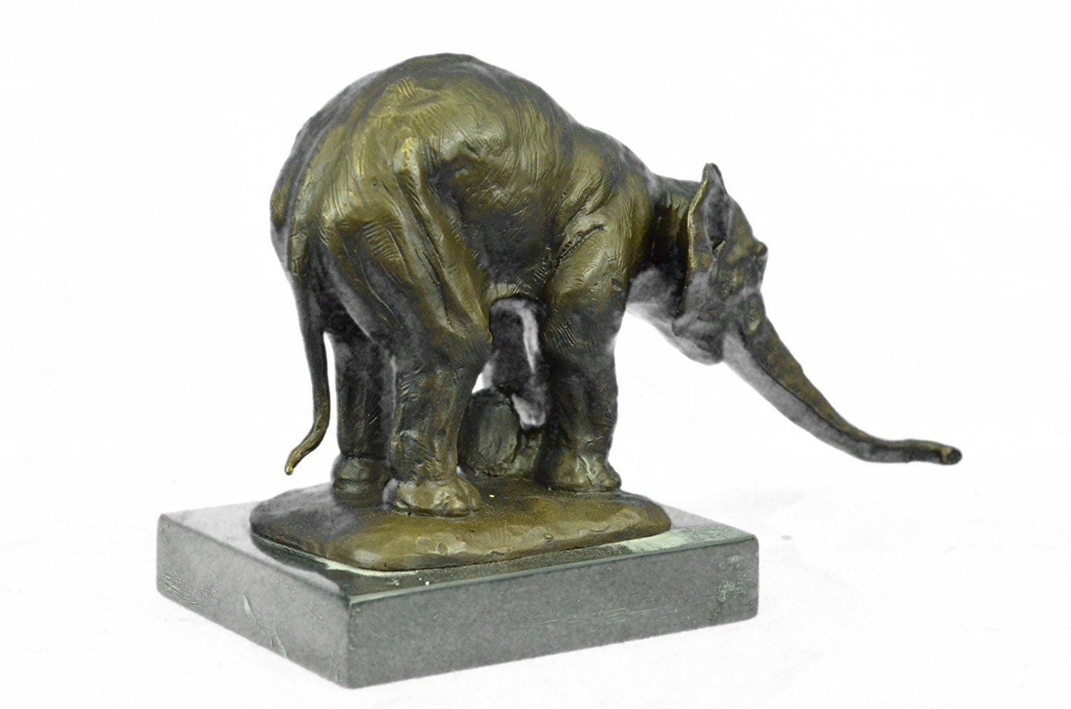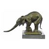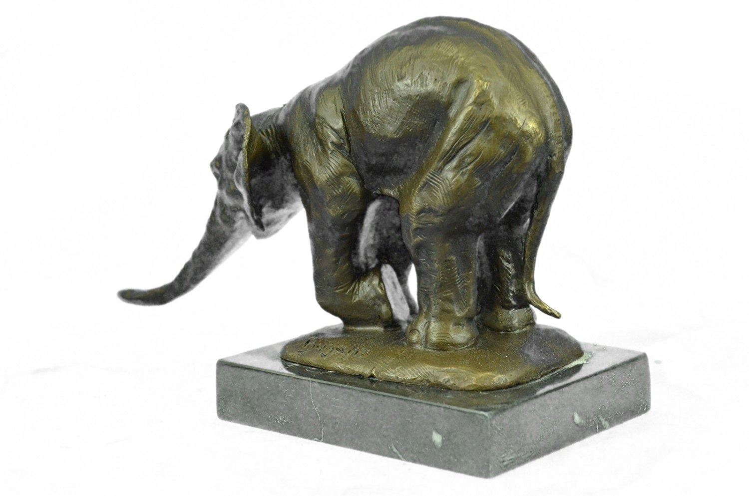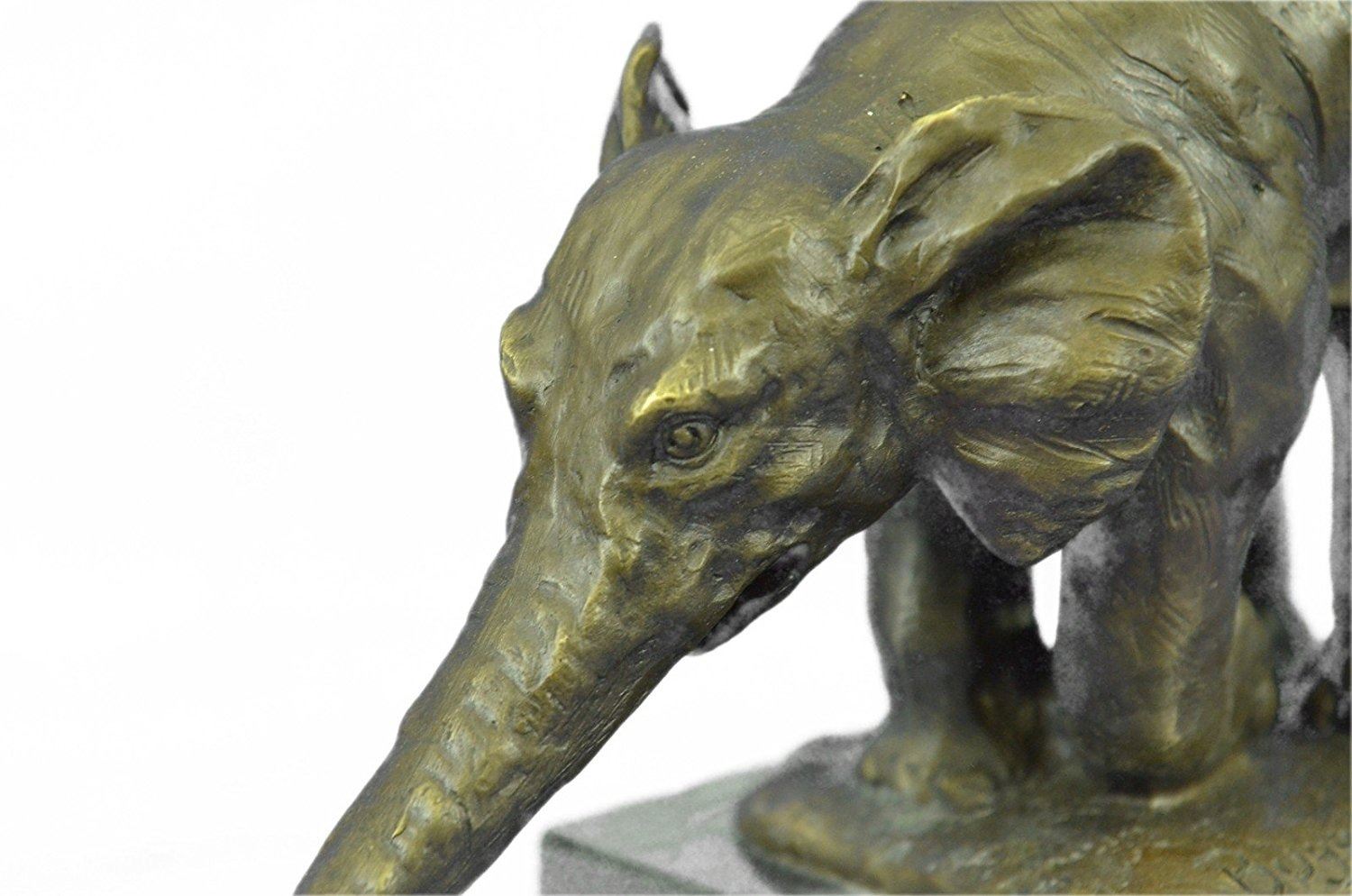 This happy elephant lets out a loud long shriek as she playfully walks across the dry dusty plains of the land. Although she is a very large size animal she is as agile and light on her feet. She bends her front leg as she walks and extends her trunk as far as it goes and continues to shriek. Her ears are flap back and forth as she gets rid of the flies. . Her tail hangs behind her and her eyes are wide. This is a beautiful sculpture depicting a happy elephant in her natural environment. If you look closely you can see the creases and texture of the skin. This bronze sculpture was cast using the Lost Wax Method and has a brown patina and is mounted on a gorgeous marble base. Bronze Dimensions with Marble Base: Height 8 X Width 12 inches. Weight: 10 LBS. Inventory: 2943K16192