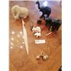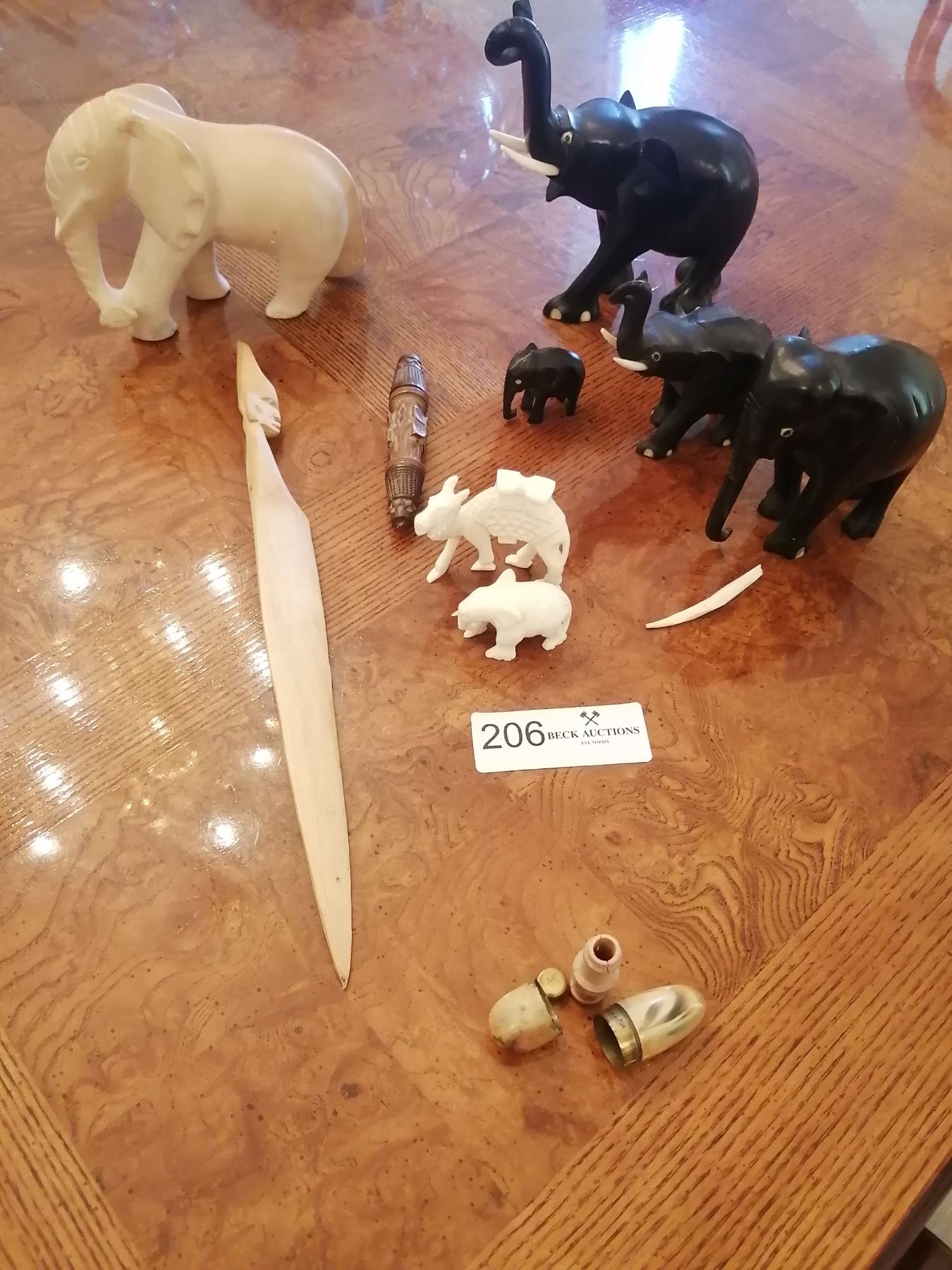 One of the elephants is missing two tusks (one is detached, one is missing), and one of the elephants is made from tusks.