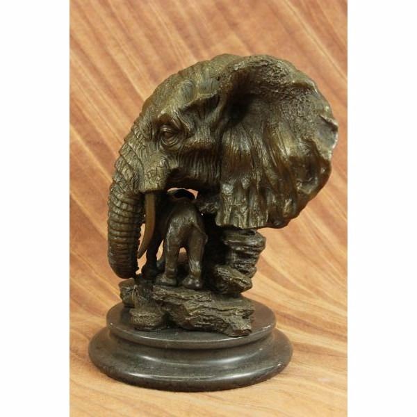 Elephant Head Bust with Baby Bronze Sculpture on marble base Statue