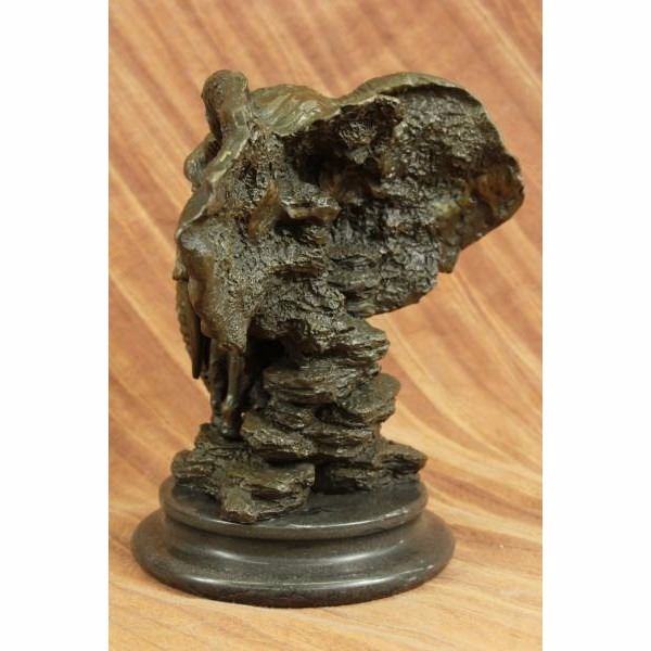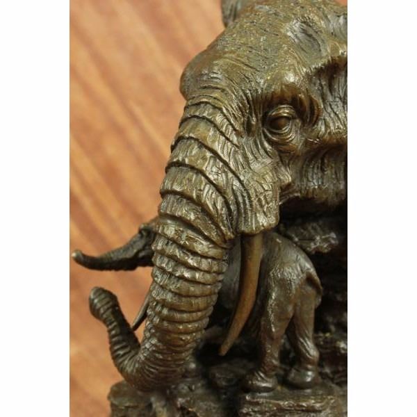 This is a striking sculpture of the massive elephant. Adding emphasize to the immensity of a real elephant the artist crafted its head much large then the rest of its body. A baby elephant manages to remain almost concealed under the trunk. The elephants ears are the largest feature of this piece spanning wide and long. The piece gives a very wild nature feel. it was crafted using the lost wax method. The sculpture rests atop a black marble base. Bronze dimensions with marble base: Height 8 X width 8 inches. Weight: 11 lbs.