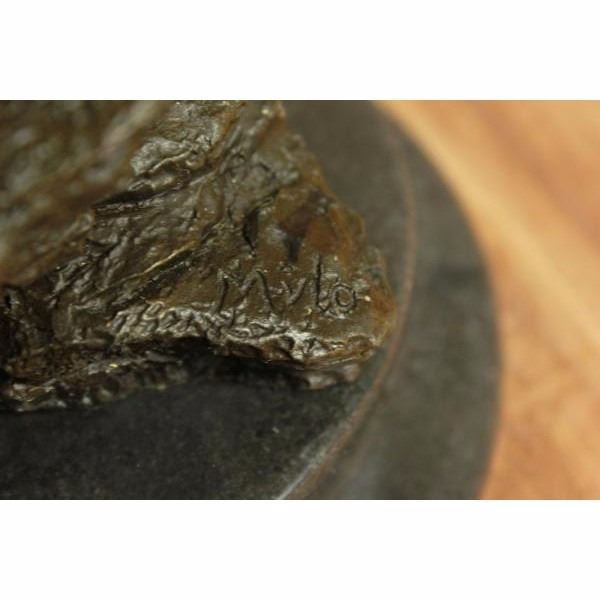 This is a striking sculpture of the massive elephant. Adding emphasize to the immensity of a real elephant the artist crafted its head much large then the rest of its body. A baby elephant manages to remain almost concealed under the trunk. The elephants ears are the largest feature of this piece spanning wide and long. The piece gives a very wild nature feel. it was crafted using the lost wax method. The sculpture rests atop a black marble base. Bronze dimensions with marble base: Height 8 X width 8 inches. Weight: 11 lbs.