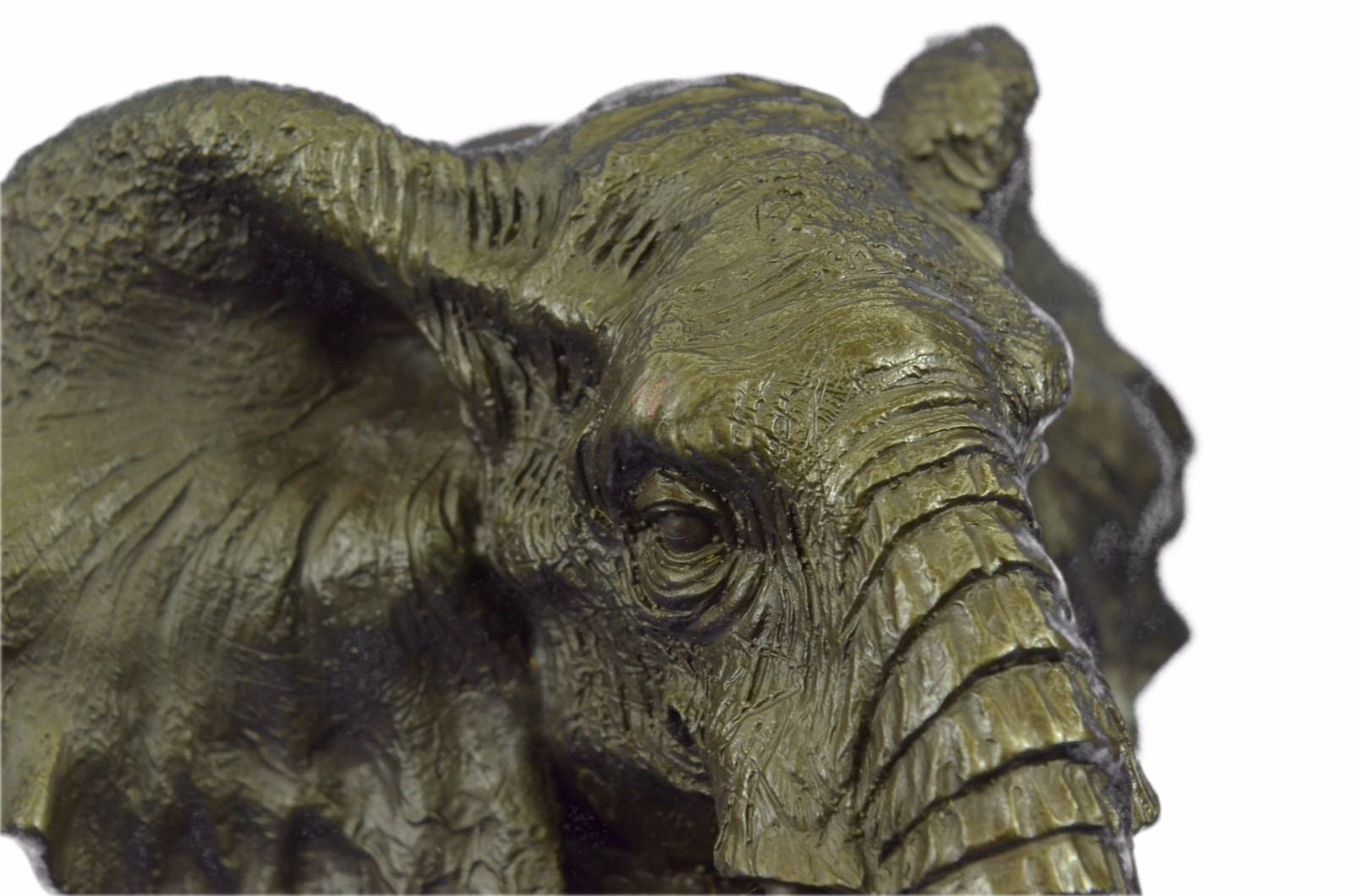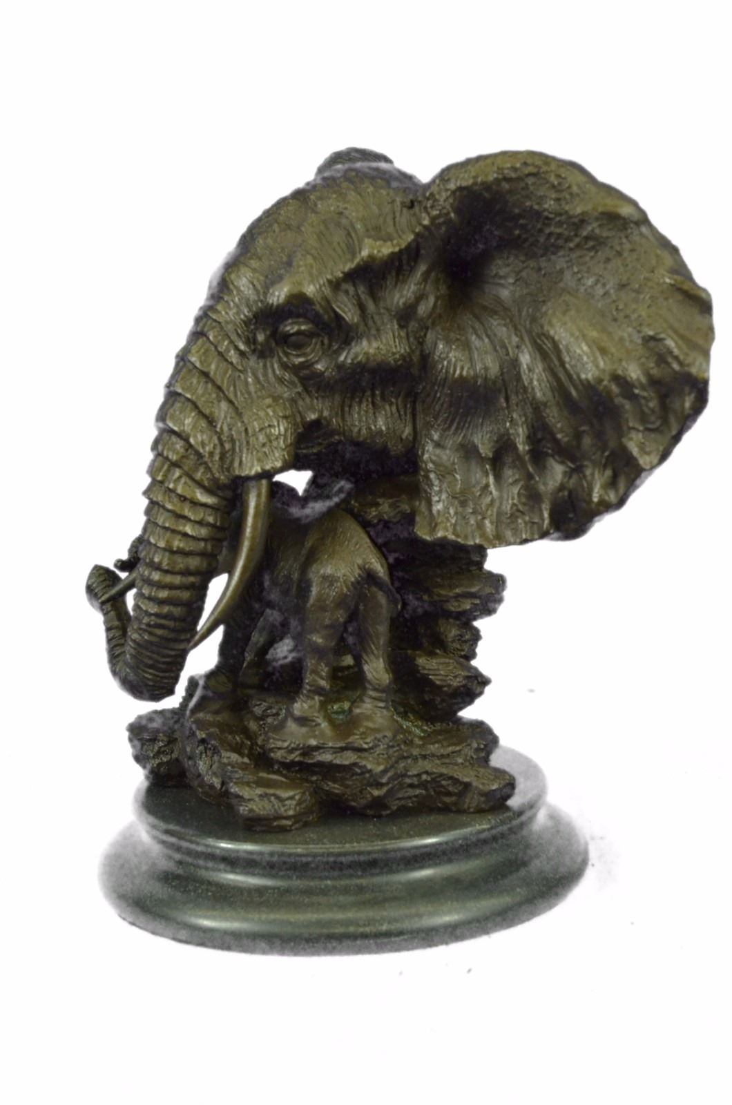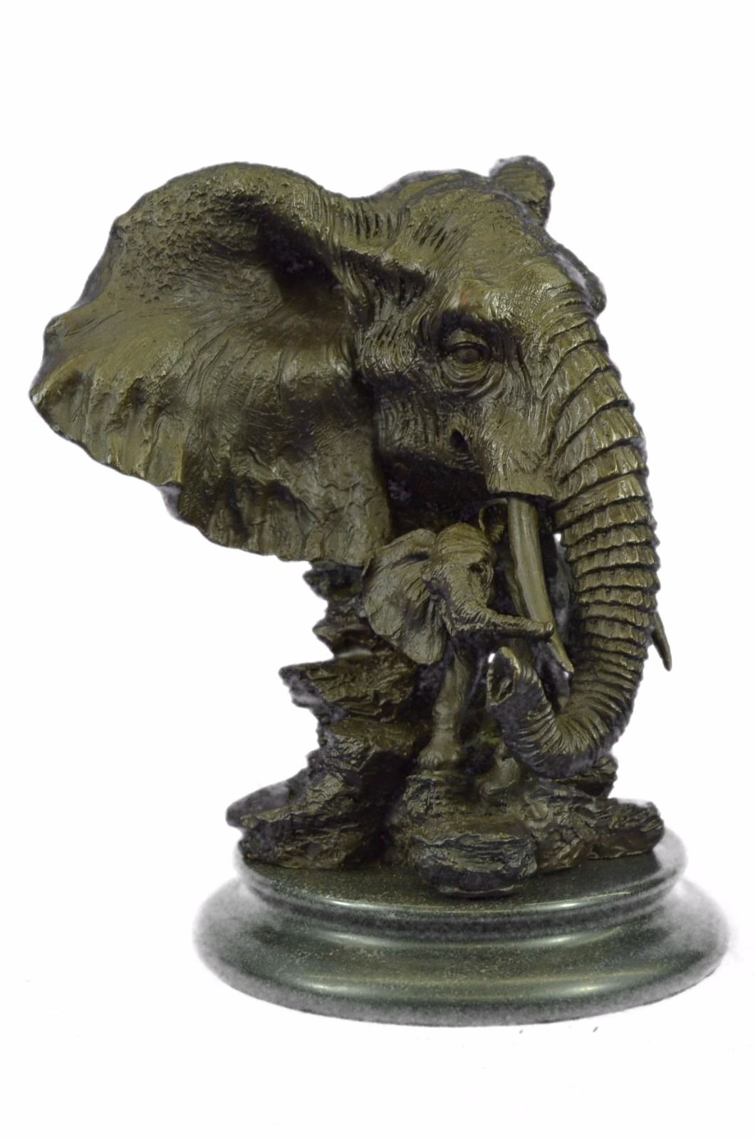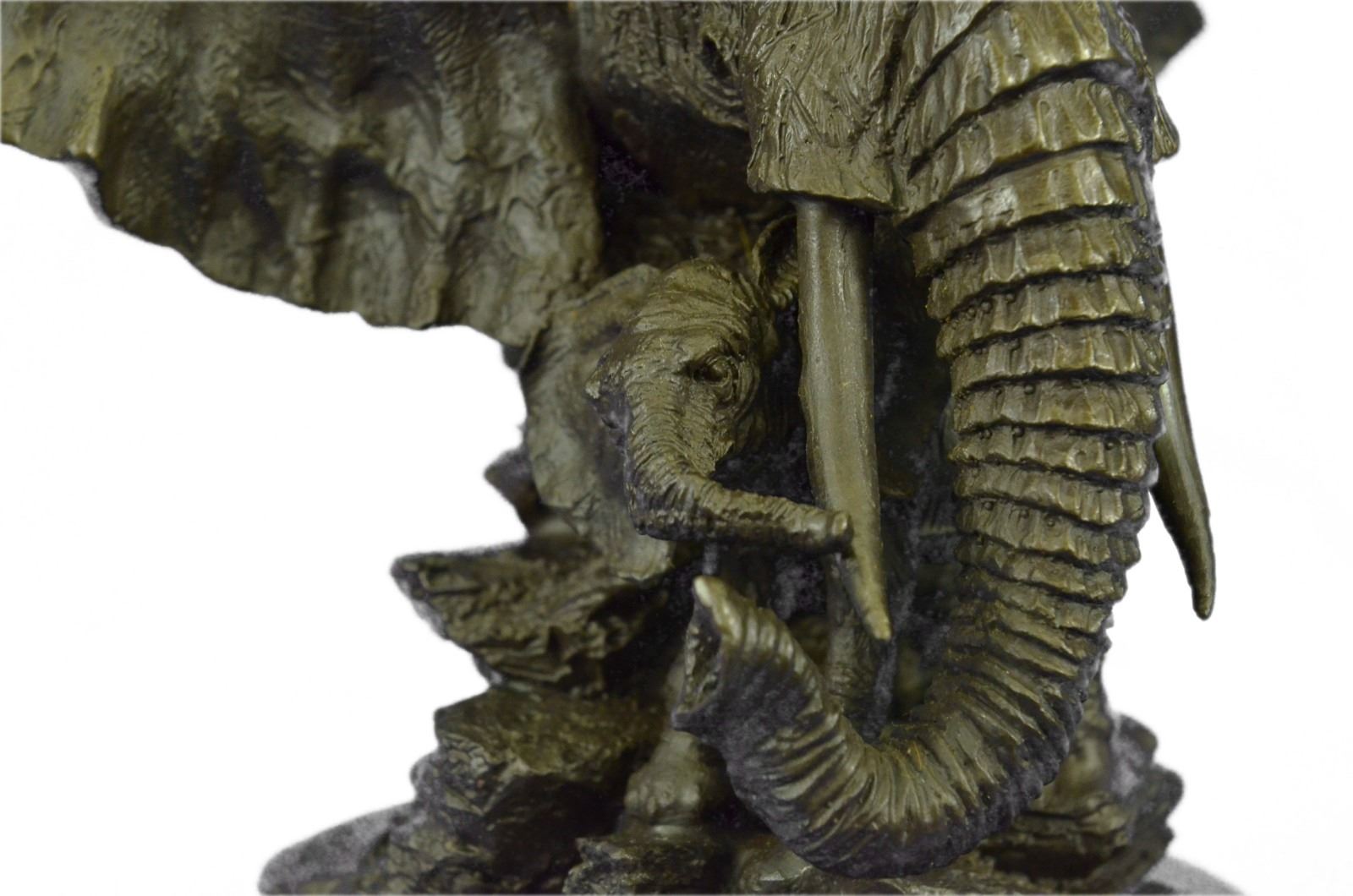 This is a striking Sculpture of the massive elephant. Adding emphasize to the immensity of a real elephant the artist crafted its head much large then the rest of its body. A baby elephant manages to remain almost concealed under the trunk. The elephants ears are the largest feature of this piece spanning wide and long. The piece gives a very wild nature feel. It was crafted using the lost wax method. The Sculpture rests atop a marble base. Bronze Dimensions with Marble Base: Height 8 X Width 8 inches. Weight: 11 LBS.