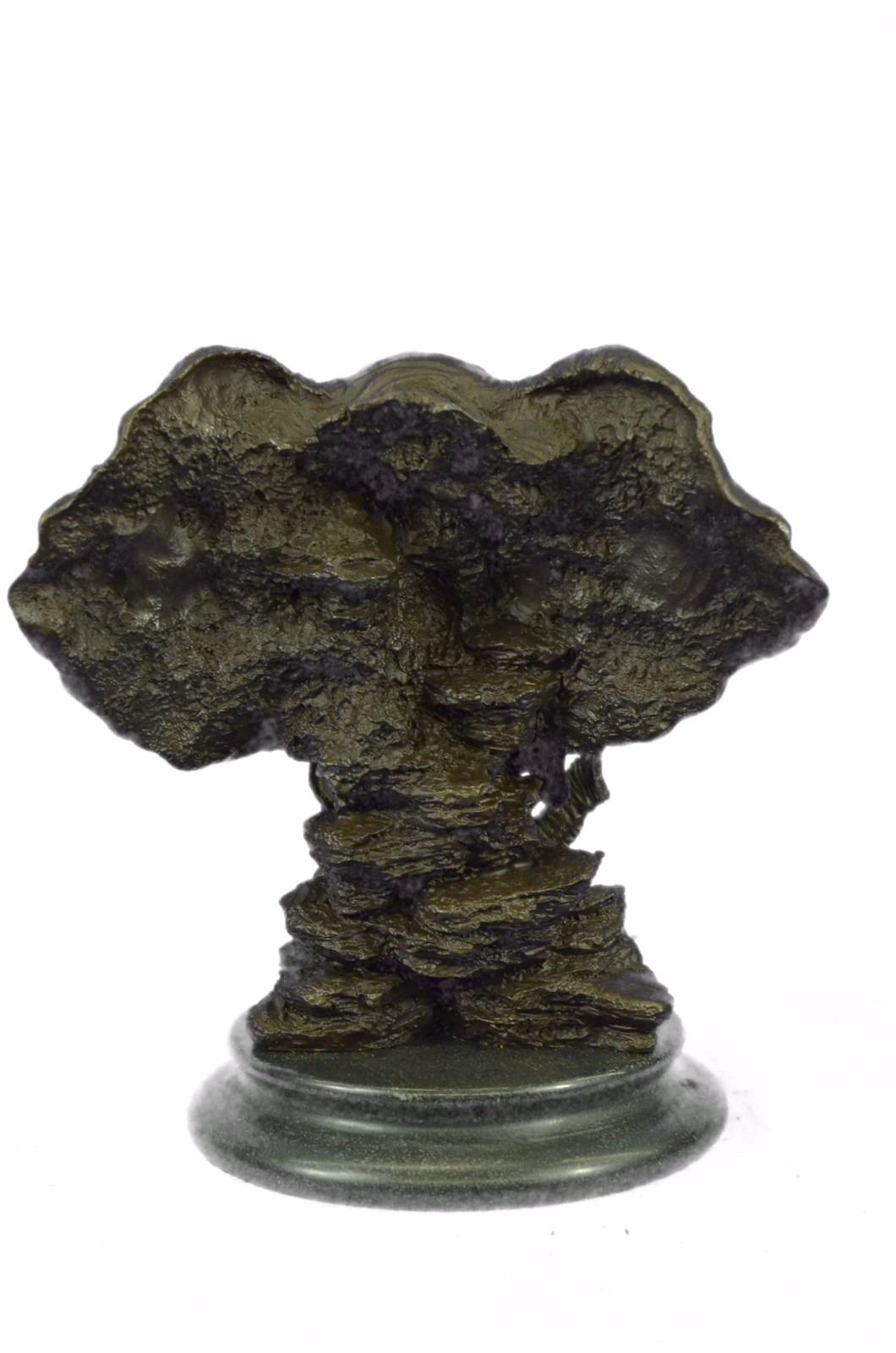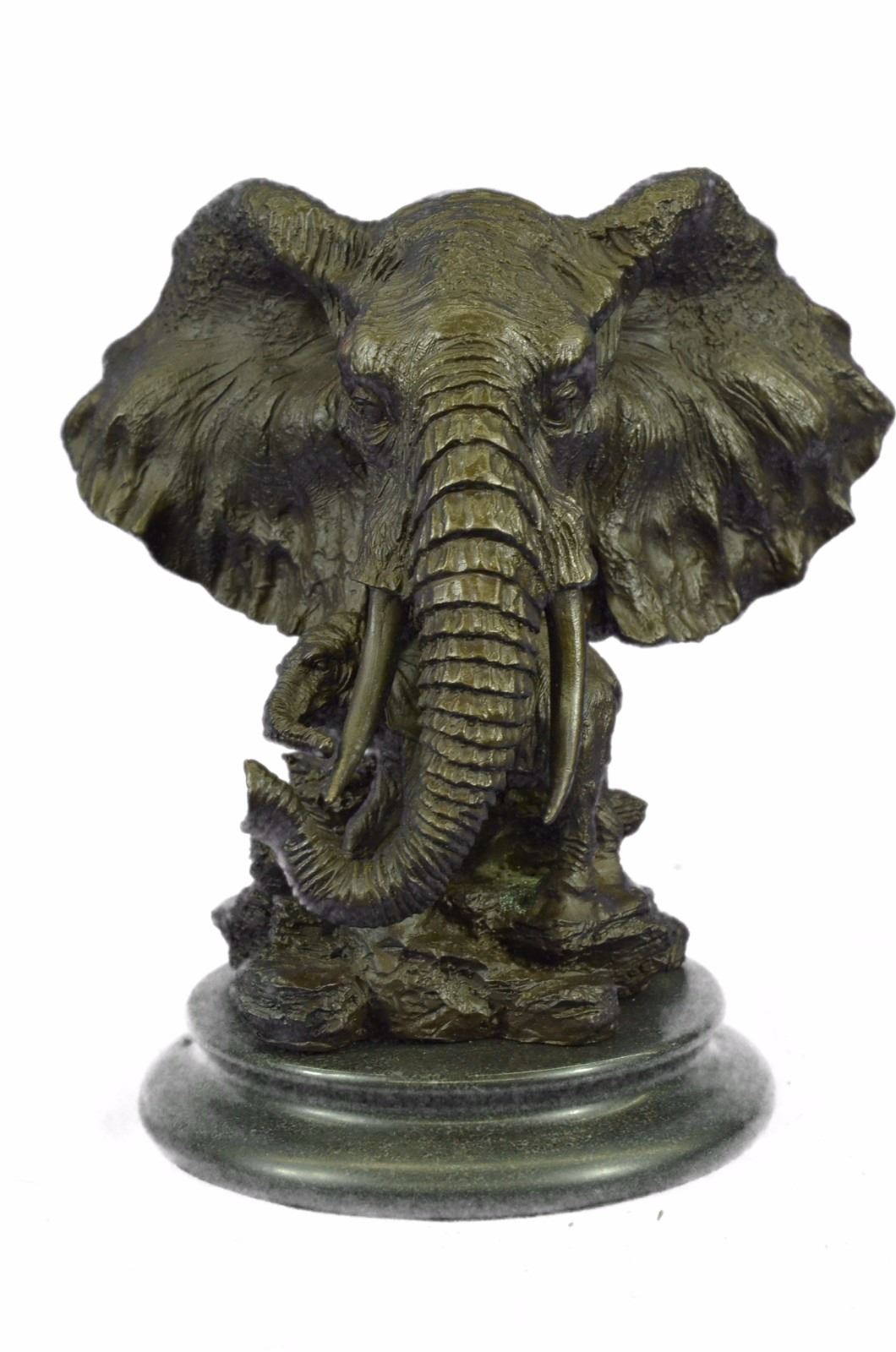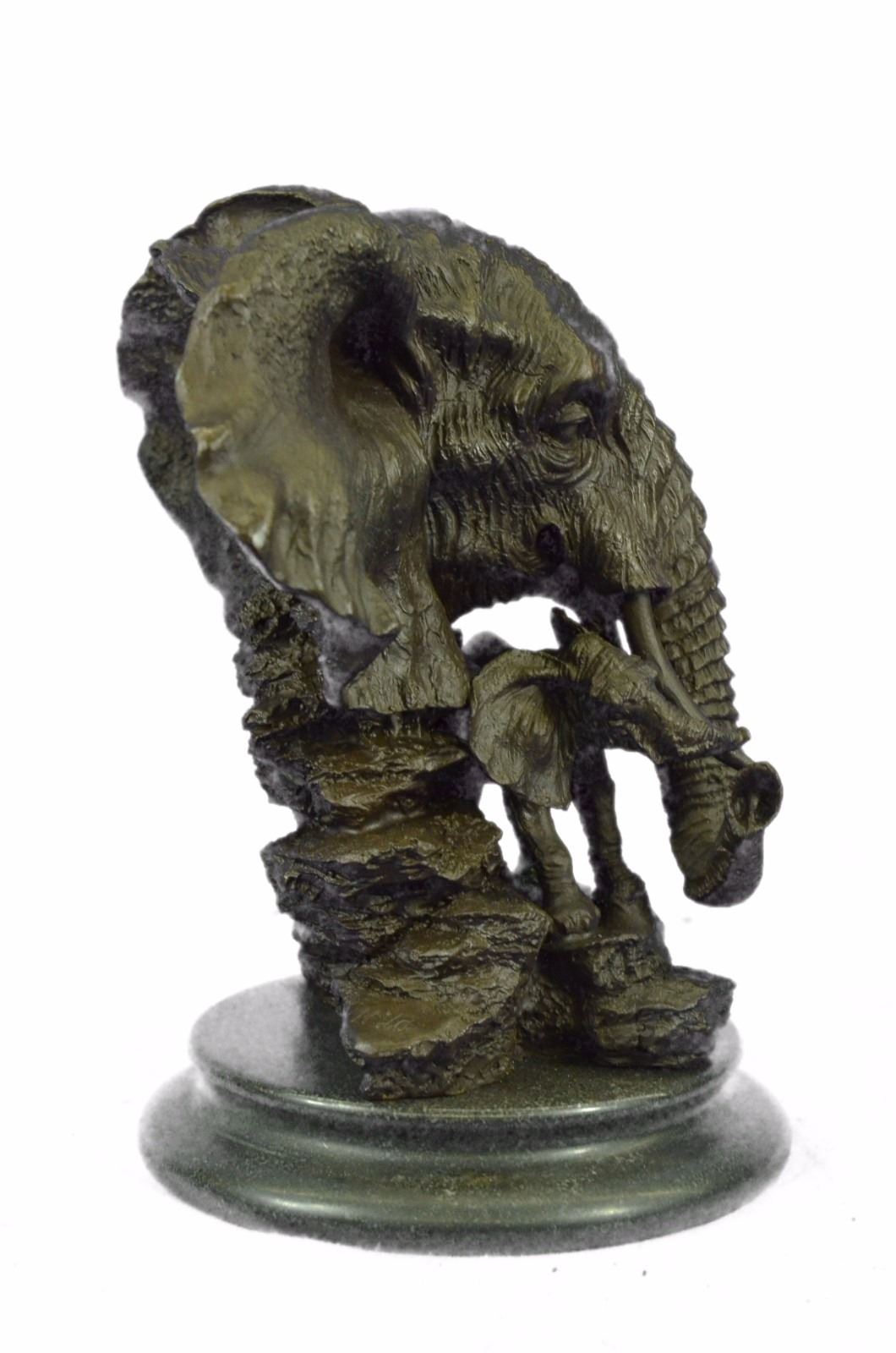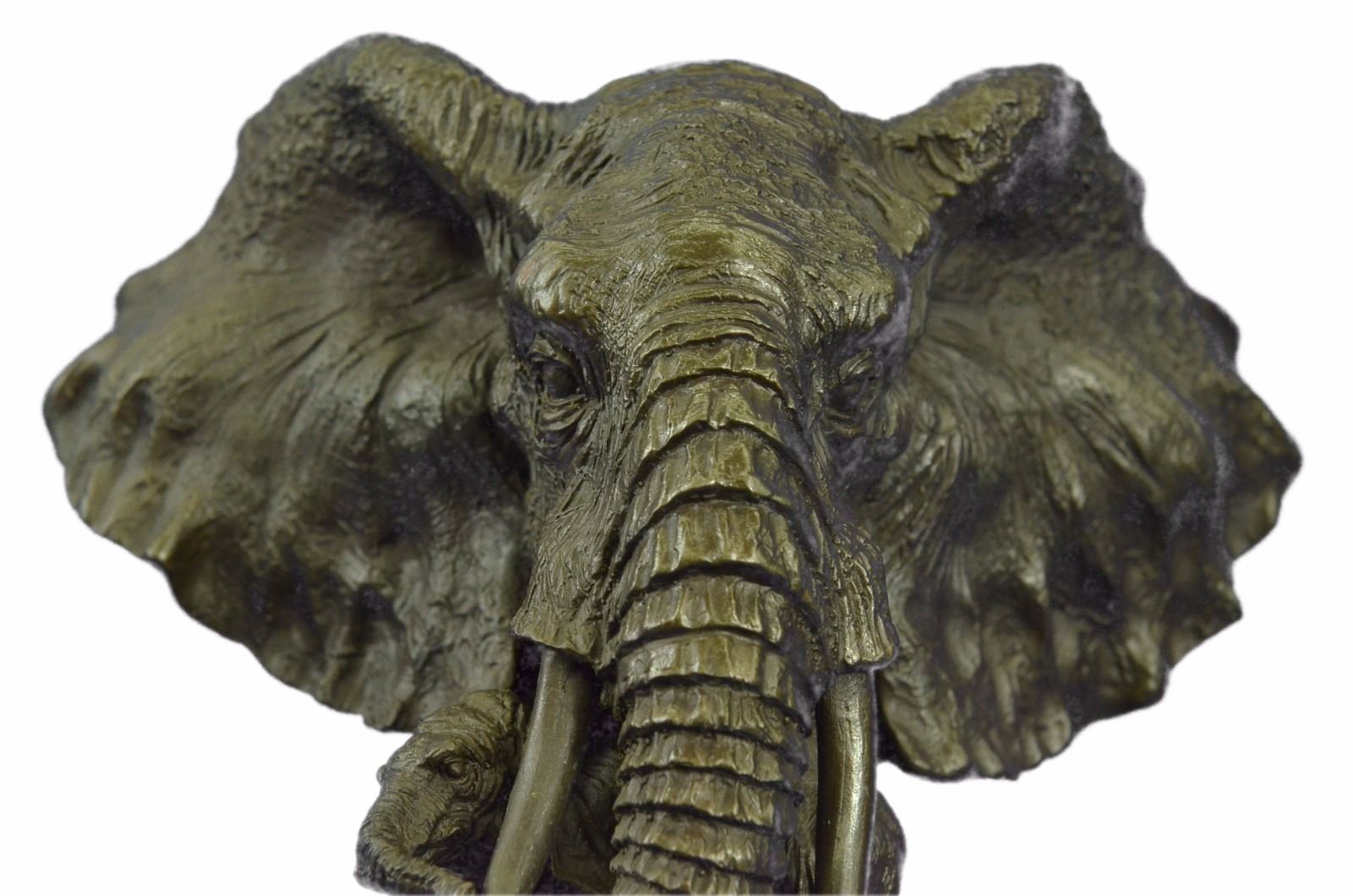 This is a striking Sculpture of the massive elephant. Adding emphasize to the immensity of a real elephant the artist crafted its head much large then the rest of its body. A baby elephant manages to remain almost concealed under the trunk. The elephants ears are the largest feature of this piece spanning wide and long. The piece gives a very wild nature feel. It was crafted using the lost wax method. The Sculpture rests atop a marble base. Bronze Dimensions with Marble Base: Height 8 X Width 8 inches. Weight: 11 LBS.