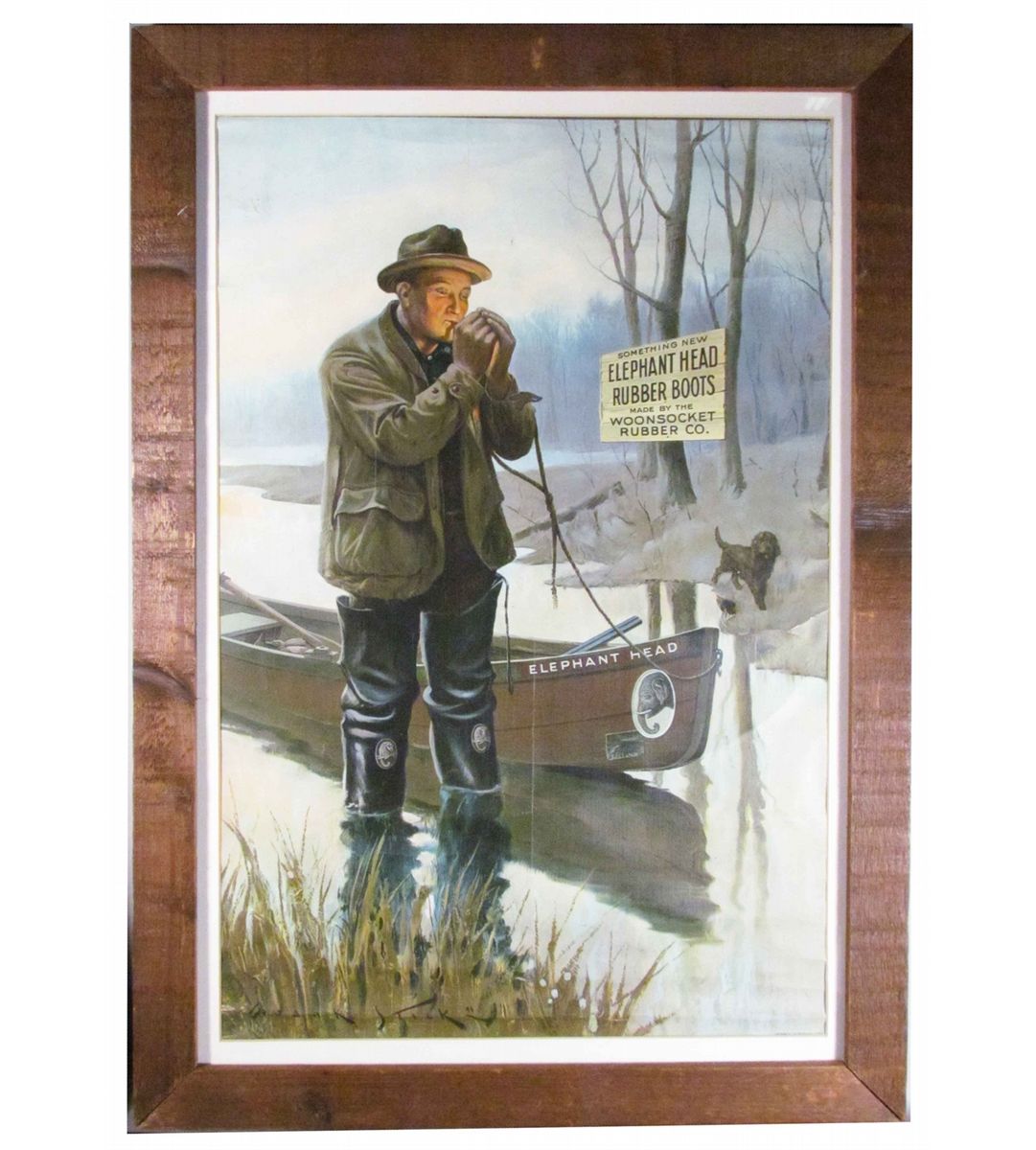 Elephant Head Rubber Boots Paper Sign. Made by The Woonsocket Rubber Co. Copyright 1911. Frank Stick artist. Original band. Minor wrinkles and repaired hole at 10:00 otherwise very good condition. 20 X 30 inches image only.