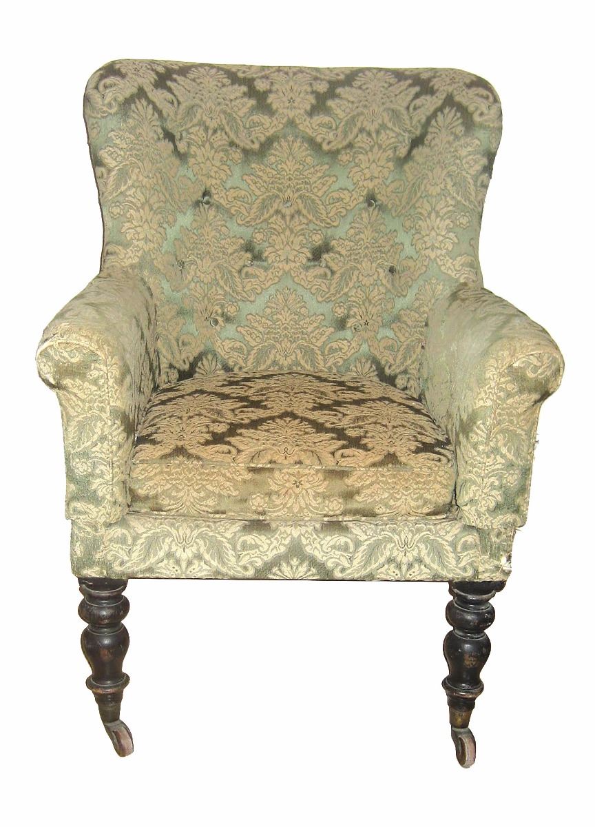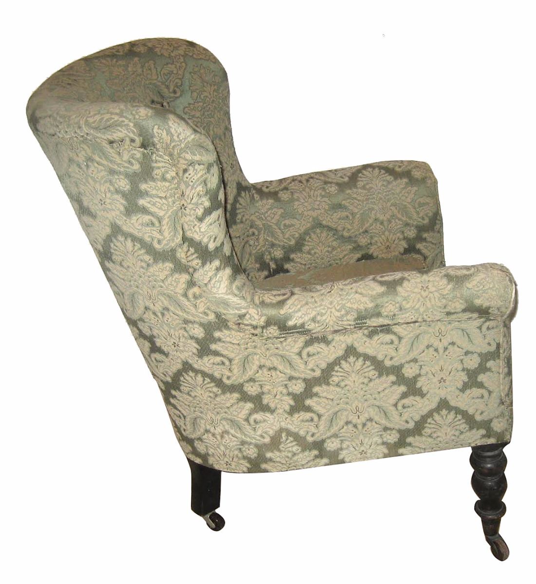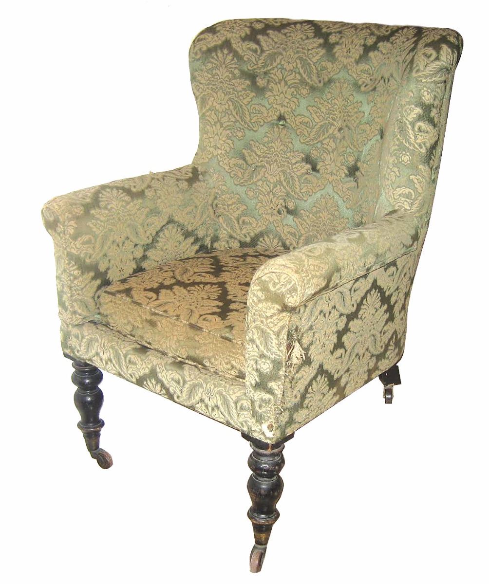 Victorian light-and-dark green ebonised tub armchair personally-owned and -used by Joseph Merrick, 'the Elephant Man.’ The custom-made armchair, measuring approximately 29.75? in width, sits on baluster turned front legs with brass cappings and ceramic castors, and slightly splayed square section back legs with replaced wheels. The reverse of the seat bears an attached strip of wood painted with the words: “The Elephant Man’s Chair.” Accompanied by four biographical books on the life of Joseph Merrick, with each depicting images of the famed Victorian chair. Also accompanied by a letter of provenance from a relative of the original recipient, in part: “William Taylor (1834–1911)—my great grandfather was engineer at London Hospital from 1876 until his retirement in January 1896. One of his sons, Edward Charles Taylor (1869–1951—my grandfather) lived with his father at 55 Lindley Street and at 66 Dempsey Street, both in Stepney until his marriage to my grandmother in 1896. It was he who used to play the violin in a private recital for Joseph’s entertainment. The special armchair was made for the Elephant Man consisting of a high seat, because of his hip, and large head pieces to the sides to support his massive head. After the Elephant Man’s death on 11th April 1890 this chair passed into the possession of my great-grandfather and came to me indirectly via my grandfather and father.” Oversized.