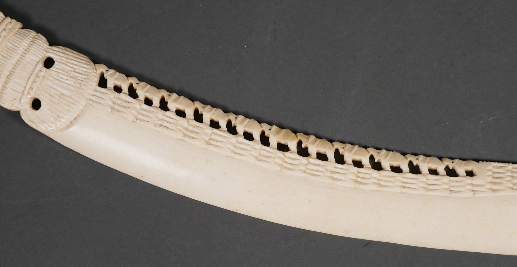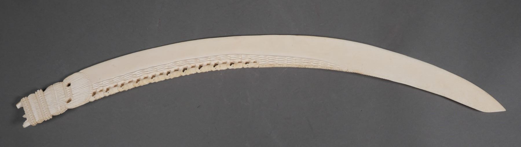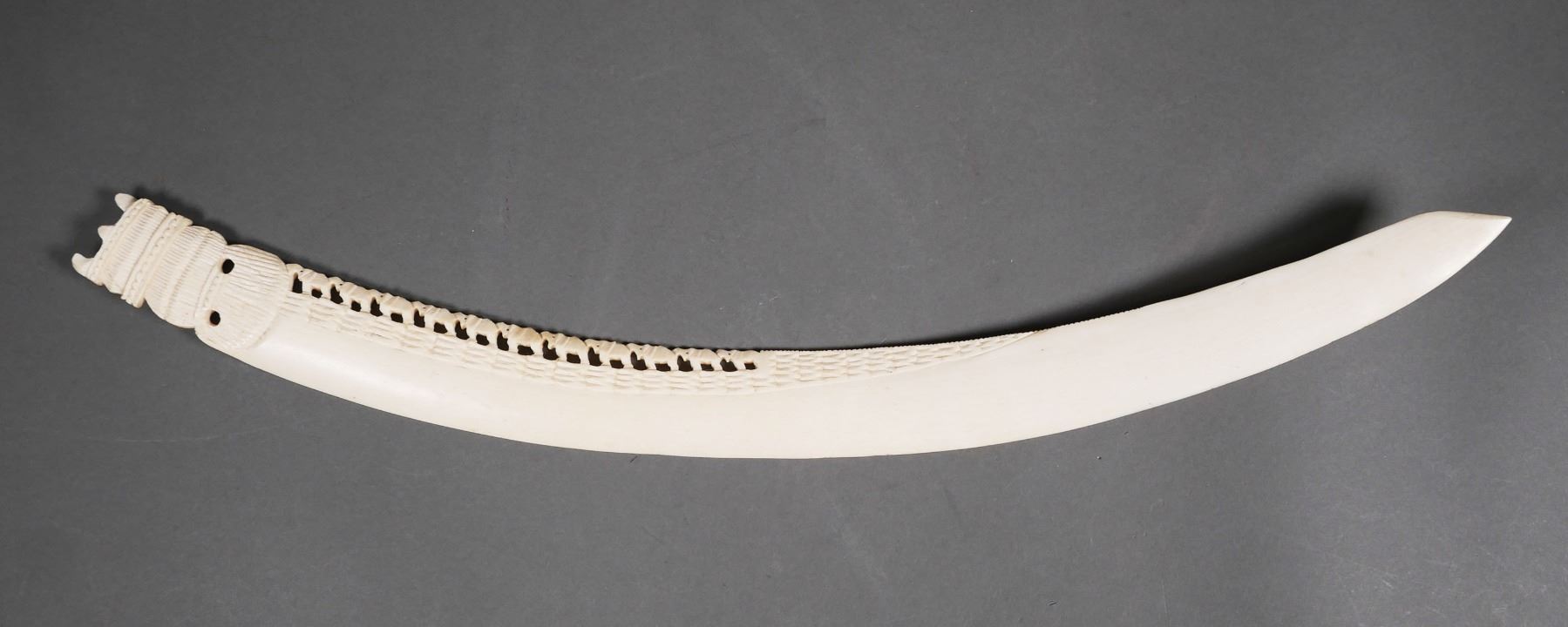 Old carved ivory tusk in the shape of a sword blade with 11 elephants tail to trunk on spine edge. Approx. 23 1/2" x 1 7/8". No cracks or chips to blade edge. See photos for more details on condition. This is antique, pre-ban African elephant ivory and can be shipped only where allowed by law.