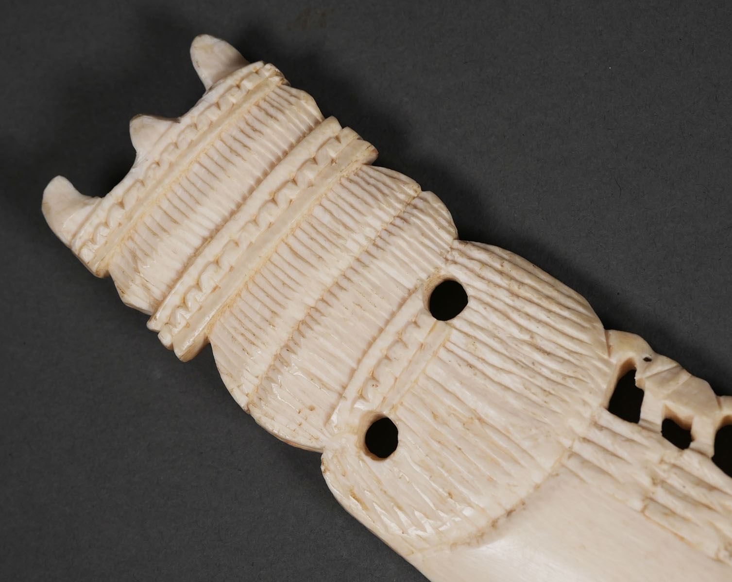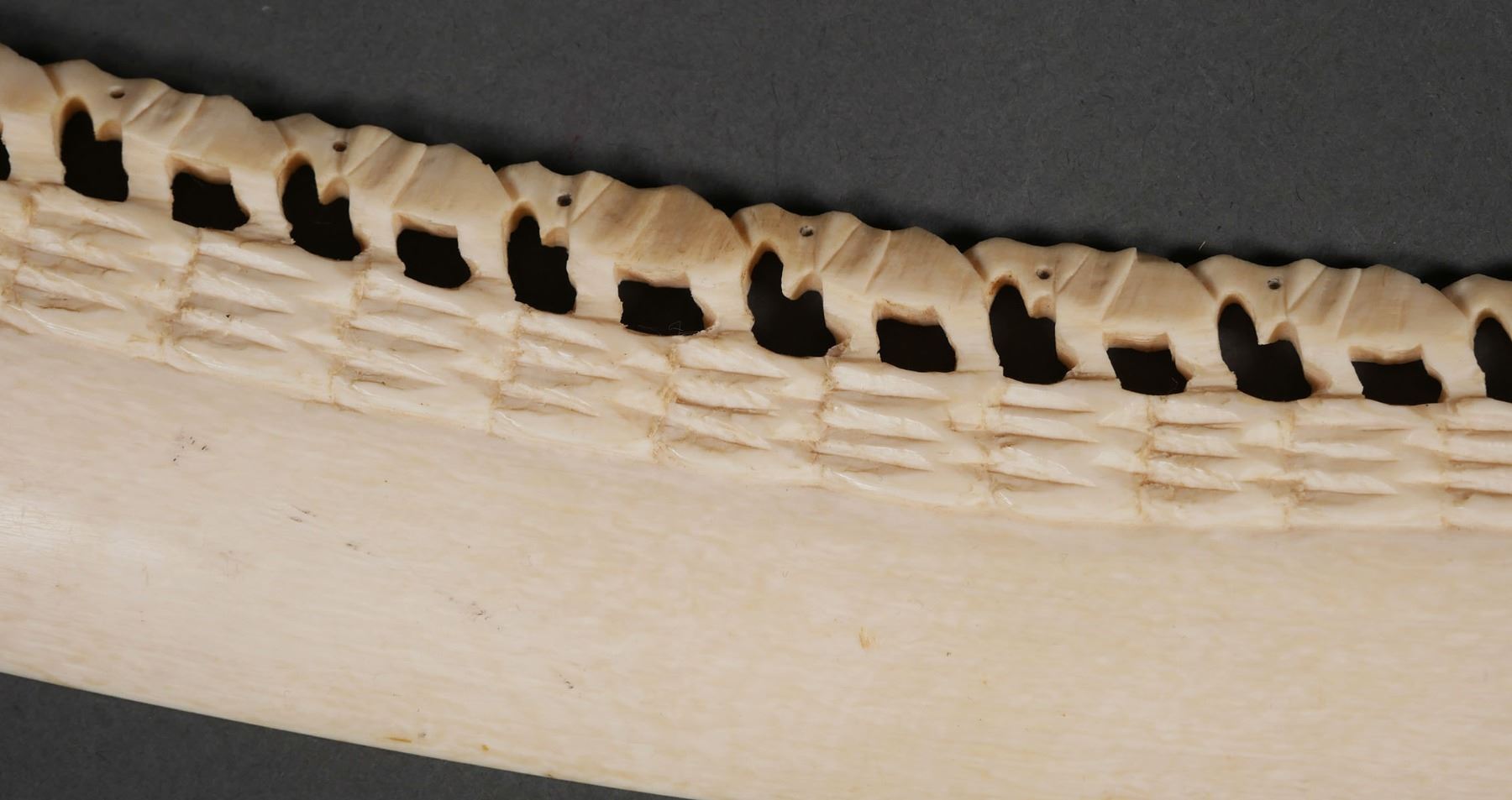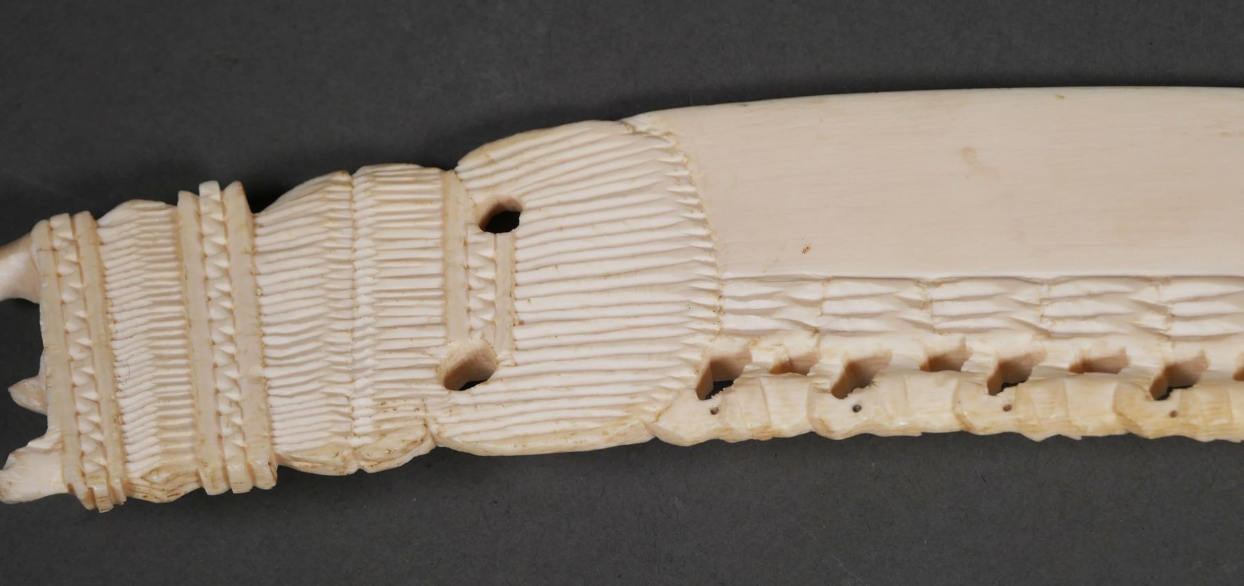Old carved ivory tusk in the shape of a sword blade with 11 elephants tail to trunk on spine edge. Approx. 23 1/2" x 1 7/8". No cracks or chips to blade edge. See photos for more details on condition. This is antique, pre-ban African elephant ivory and can be shipped only where allowed by law.