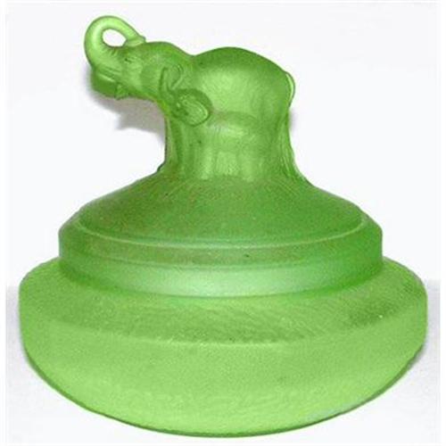 </font></strong>GUARANTEED ORIGINAL - Produced during the 1930s from green satin Depression glass this powder jar features three elephants, a mother her two babies, all with their trunks facing up and is shown and described on pages 14?15 in Whitmyer. Measuring about 6 inches in diameter and in excellent condition </font>