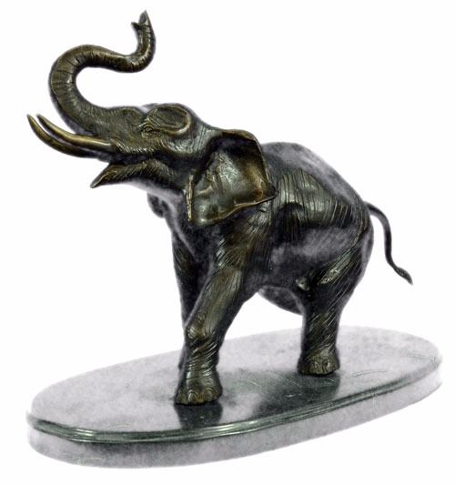 This Is A Beautiful Bronze Sculpture Of A Wild Elephant Being Content On The Wide Open Plains. This Sculpture Was Cast Using The "Lost Wax Method" And Has A Gorgeous Two Tone Brown Patina. He Walks Proudly Through The Dusty Plains Lifting His Trunk Up Towards The Sky While Letting Out A Loud Elephants Trumpet To Let His Presence Be Known. The Texturized Skin Of The Elephant Is Amazing In Detail With Scales, Creases And All. The Facial Structure Is Amazing With Great Proportion Giving This Sculpture A Real Life Like Feel. His Legs Are Thick Like The Pillars Of A Palace And His Body Sits With Ease On Top Of Them. His Tusks Are Fully Grown And His Ears Flap Scaring Off The Flies. 100% bronze sculpture, this brown patina sculpture was cast using the "lost wax method" and mounted on a black marble base. This sculpture is very interesting a bronze recast based on the original piece. Bronze Dimensions With Marble Base: Height 14 X Width 17 inches. Weight: 17 Lbs.