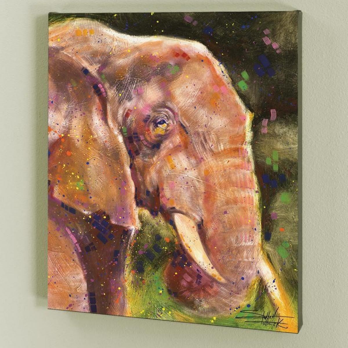 With bright colors and expressive lines, Stephen Fishwick puts a unique spin on pop culture portraits. "Elephant" is a limited edition giclee on stretched canvas, numbered and bears the artist's authorized signature. This piece comes gallery wrapped! Includes Certificate of Authenticity! Measures approx. 16" x 20" (image).