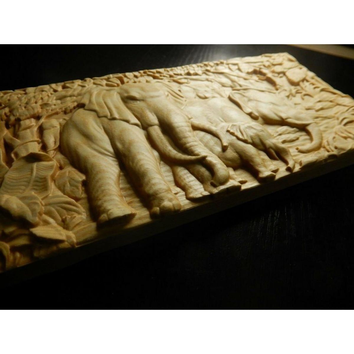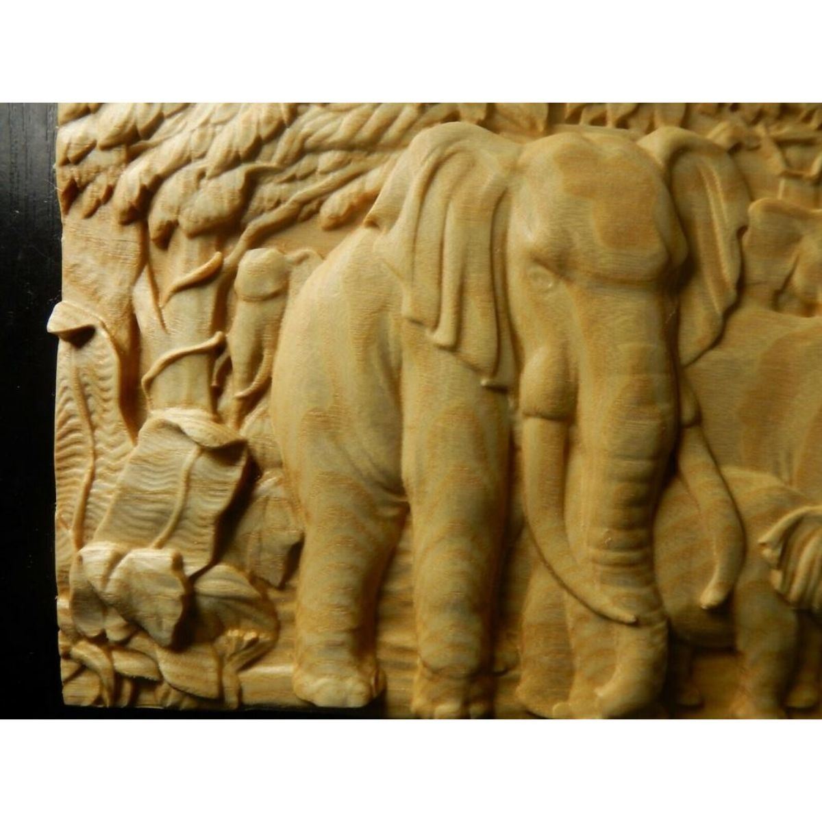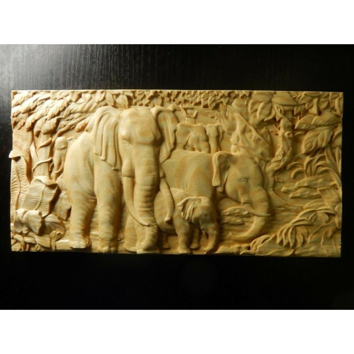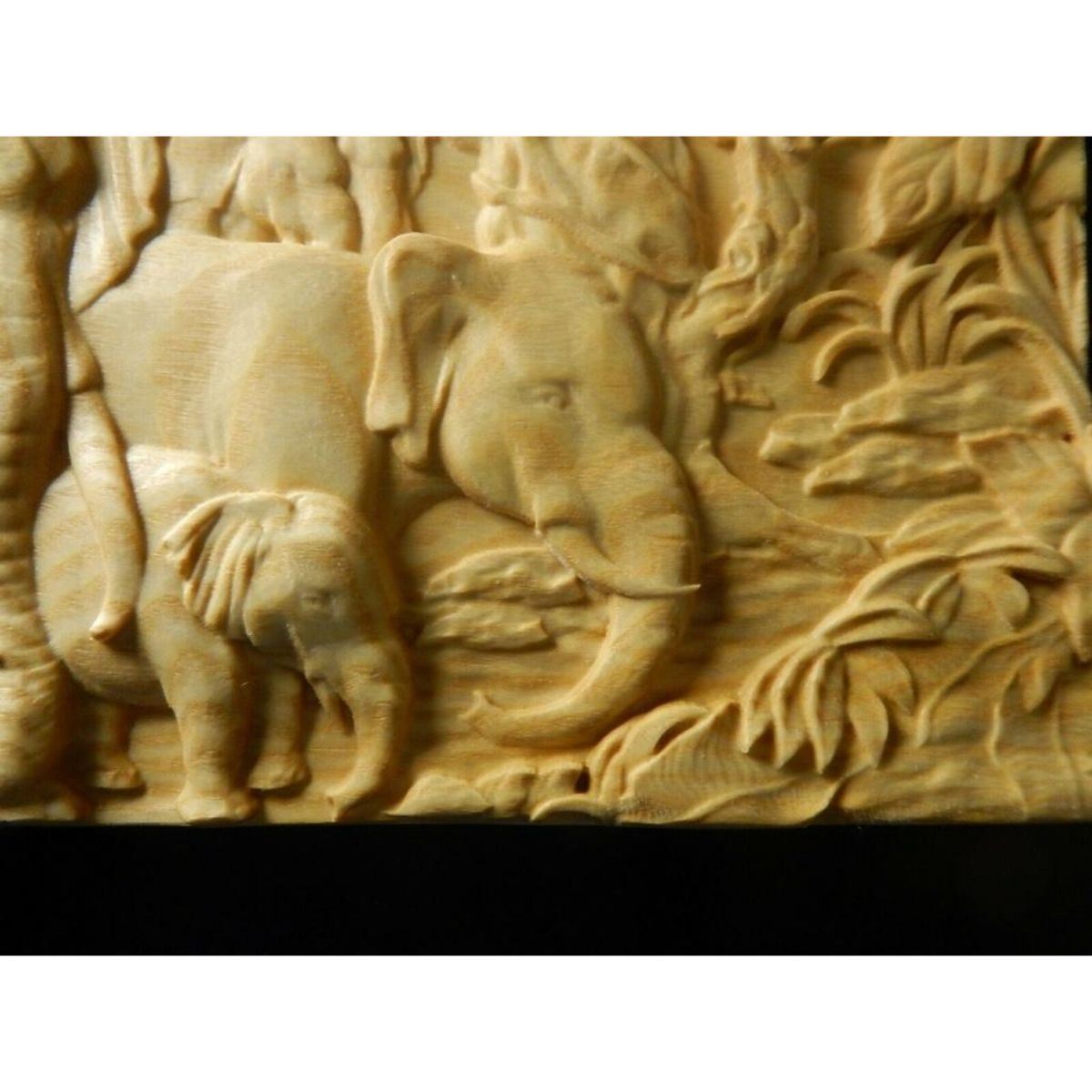 Elephant family in jungle carving, made from Ash tree wood by Lithuanian artisan. Finished with beeswax & linen oil. 5" X 10".