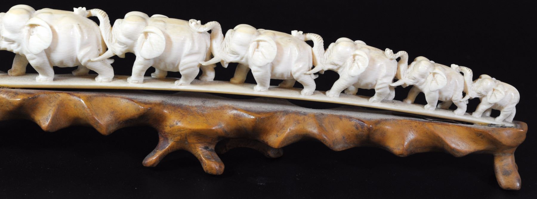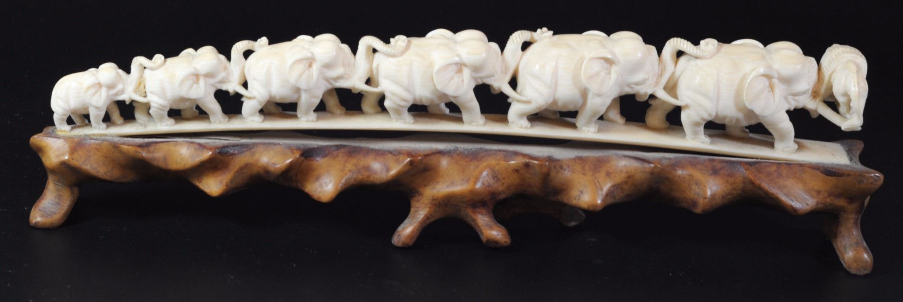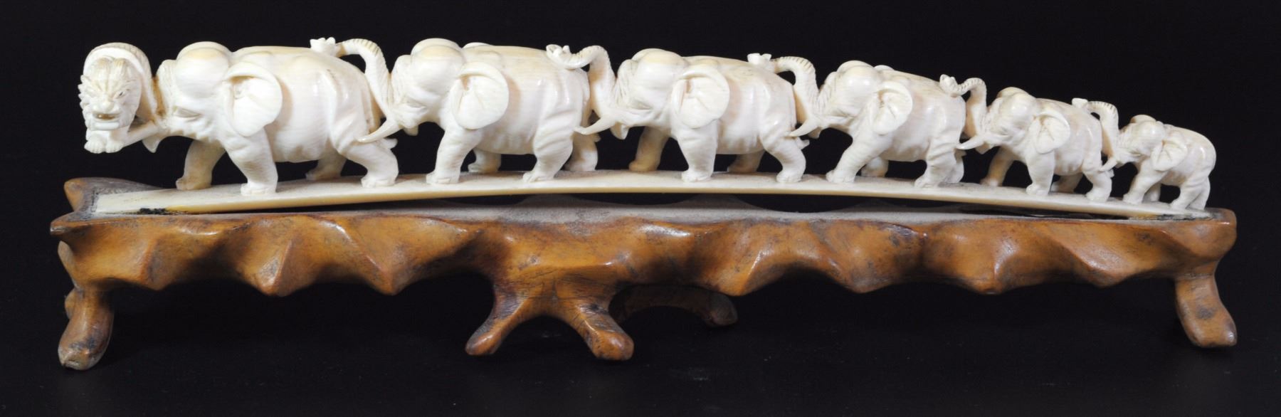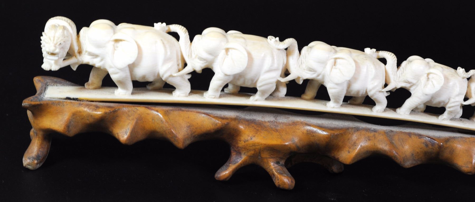 Elephants and a lion walking in a line, old quality ivory carving, circa 20th century, mounted on matching wooden base, length: 25 cm.