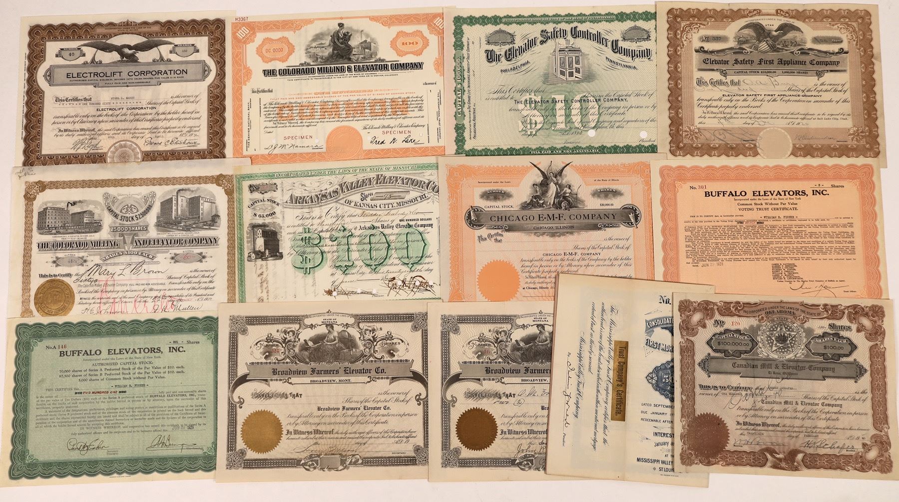 Lot of 13 stock certificates from elevator companies, agricultural and commercial: Electrolift Corp.; Colorado Milling & Elevator Co.; Elevator Safety Controller co.; Arkansas Valley Elevator Co.; Buffalo Elevators, Inc.; Broadview Farmers' Elevator Co. State: City: Date: Provenance: Ken Prag Collection