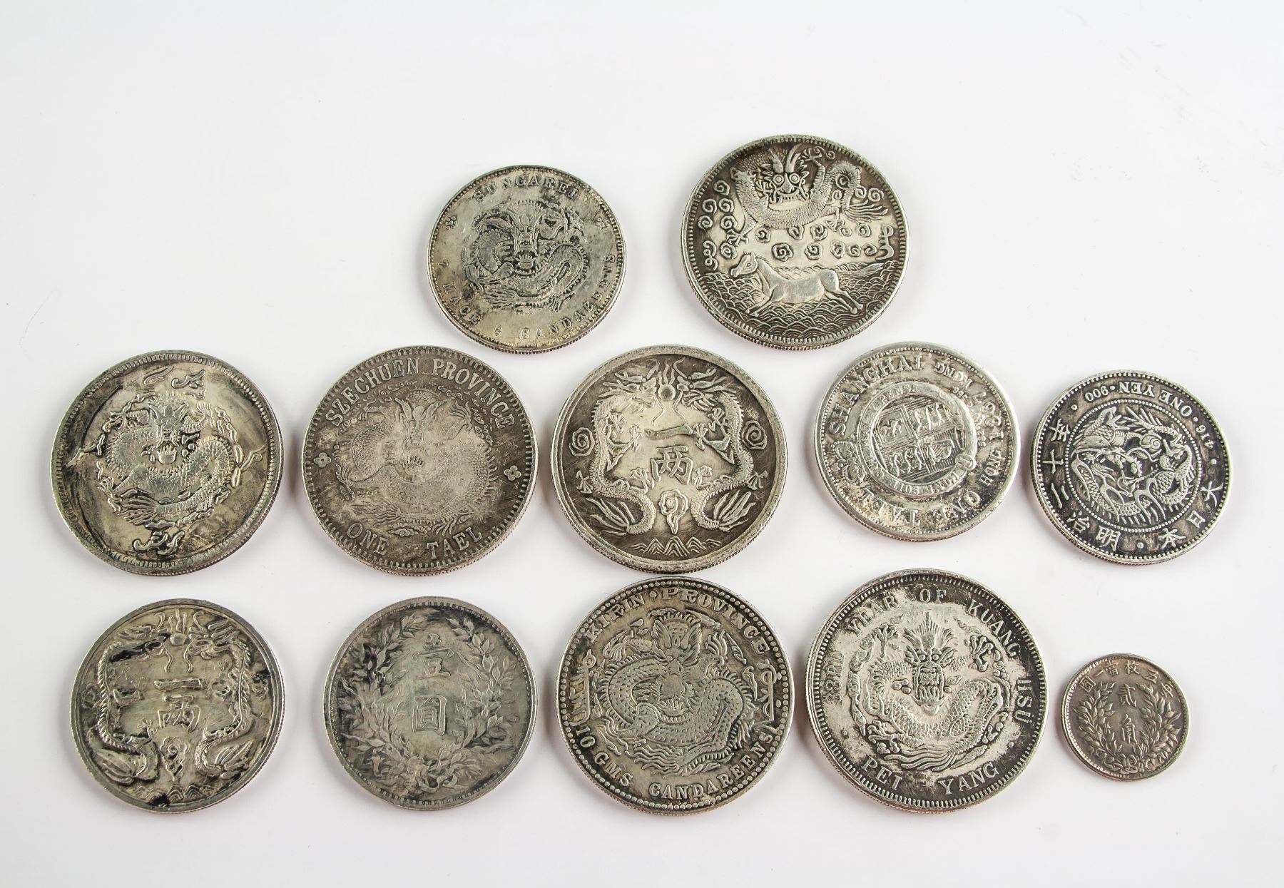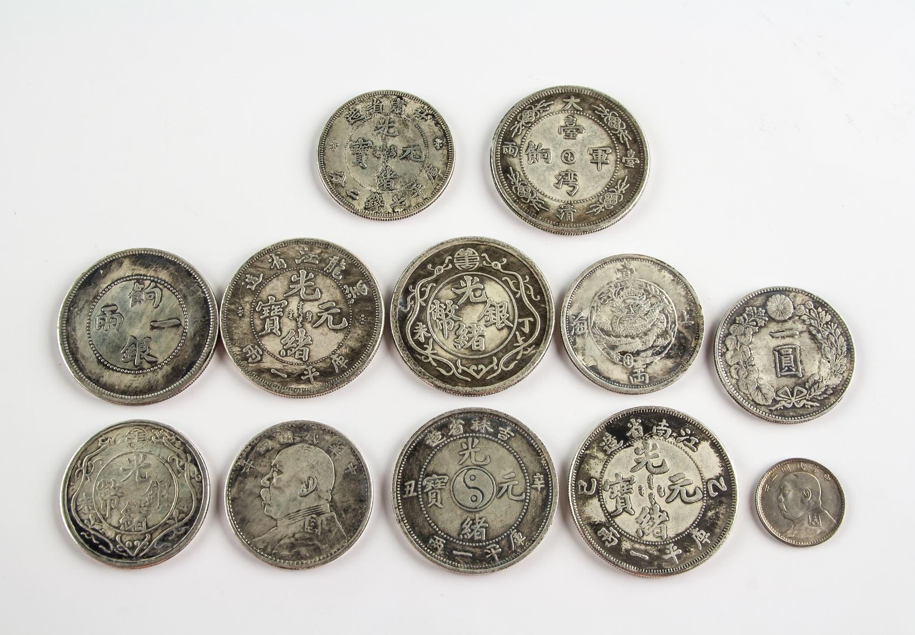 Eleven assorted silver and pattern coins of China and Japan; 11 coins featured in this lot include: 1901 Guangxu Yuanbao Jilin mint; Taiwan Daqing Jun Xiang; 1867 Shang Hai 1 Teal; Gansu Guangxu Yuanbao; 1887 Japanese Meiji 20 Year 1 Yen Coin; 1907 Guangxu Yibi 1 Liang Coin; 1915 China Republic 1 Dollar Coin; Chinese Guangxu Yuanbao One Tael Coin; Chinese Guangxu Yuanbao 1 Liang Coin; 1905 Chinese Xinjiang Yi Liang Coin LM-841; 1913 China Er Jiao Coin; Weight: ranging from 22.315-4.833 grams; Density: ranging from 8.30-8.49
