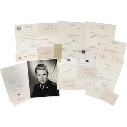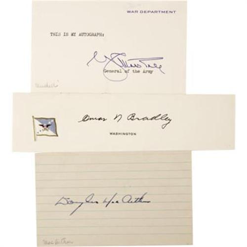 <B>Eleven Autographs of 1950s Military Luminaries and One of a Presidential Advisor,</B></I> included are the following: U.S. Army Chief of Staff J. <B>Lawton Collins,</B></I> signed card; General <B>J.E. Hull,</B></I> Far East Command, TLS; General <B>Douglas MacArthur,</B></I> signed card; General <B>George Marshall,</B></I> signed card; Air Force General <B>Lauris Norgstad,</B></I> NATO Commander, SP; Secretary of the Air Force <B>Donald A. Quarles,</B></I> autograph card; Secretary of the Army <B>Robert T. Stevens,</B></I> signed card; General <B>Hoyt S. Vandenburg,</B></I> Air Force Chief of Staff, signed card; General <B>N.E. Twinning,</B></I> Air Force Chief of Staff, signed card; General <B>Maxwell D. Taylor,</B></I> Army Chief of Staff, signed card; <B>Harold E. Talbot,</B></I> Secretary of the Air Force, signed card; <B>Robert B. Anderson,</B></I> Secretary of the Navy, signed card; General <B>Omar N. Bradley,</B></I> Chairman, Joint Chiefs of Staff, signed card; <B>Robert Montgomery,</B></I> actor, served as Eisenhower's coach in public speaking and overall media presentation, autograph card.<BR>All items very fine to excellent condition. <I>From the collection of Henry E. Luhrs.</B></I><BR><BR><b>Shipping:</b> Miscellaneous Collectibles, Smal (<a target="_blank" href="http://www.heritageauctions.com/common/shipping.php">view shipping information</a>)