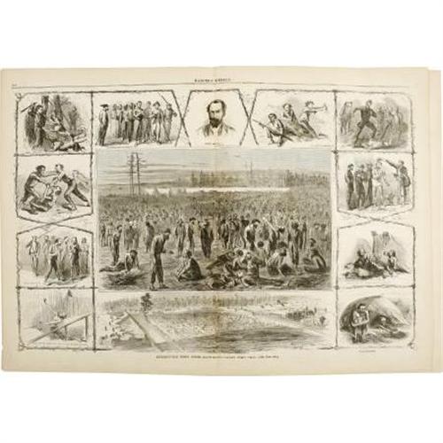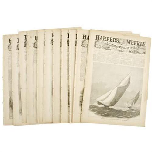 <B>Large Group Lot of Eleven Civil War Era Issues of </B></I><B><I>Harper's Weekly</B></I></B></I> (New York: Harper Brothers, 1865), about 16 pages each, elephant folio (11.5" x 16"), with the typical yellowing and minor chipping to pages due to the high acid content of the paper. Of note is a September 16, 1865 issue with double page engraving of the horrors of Andersonville Prison; a July 29, 1865 issue with engravings of the Fire at Barnum’s Museum; an October 7, 1865 issue with a full page engraving of the Andersonville Cemetery; a June 17 issue with an engraving of the capture of Jefferson Davis; February 4; February 11; February 18; February 25; March 25; April 22; and September 30, 1865 issues. They are, generally, in very good condition.<BR><BR><BR><b>Shipping:</b> Flat Material, Large (<a target="_blank" href="http://www.heritageauctions.com/common/shipping.php">view shipping information</a>)