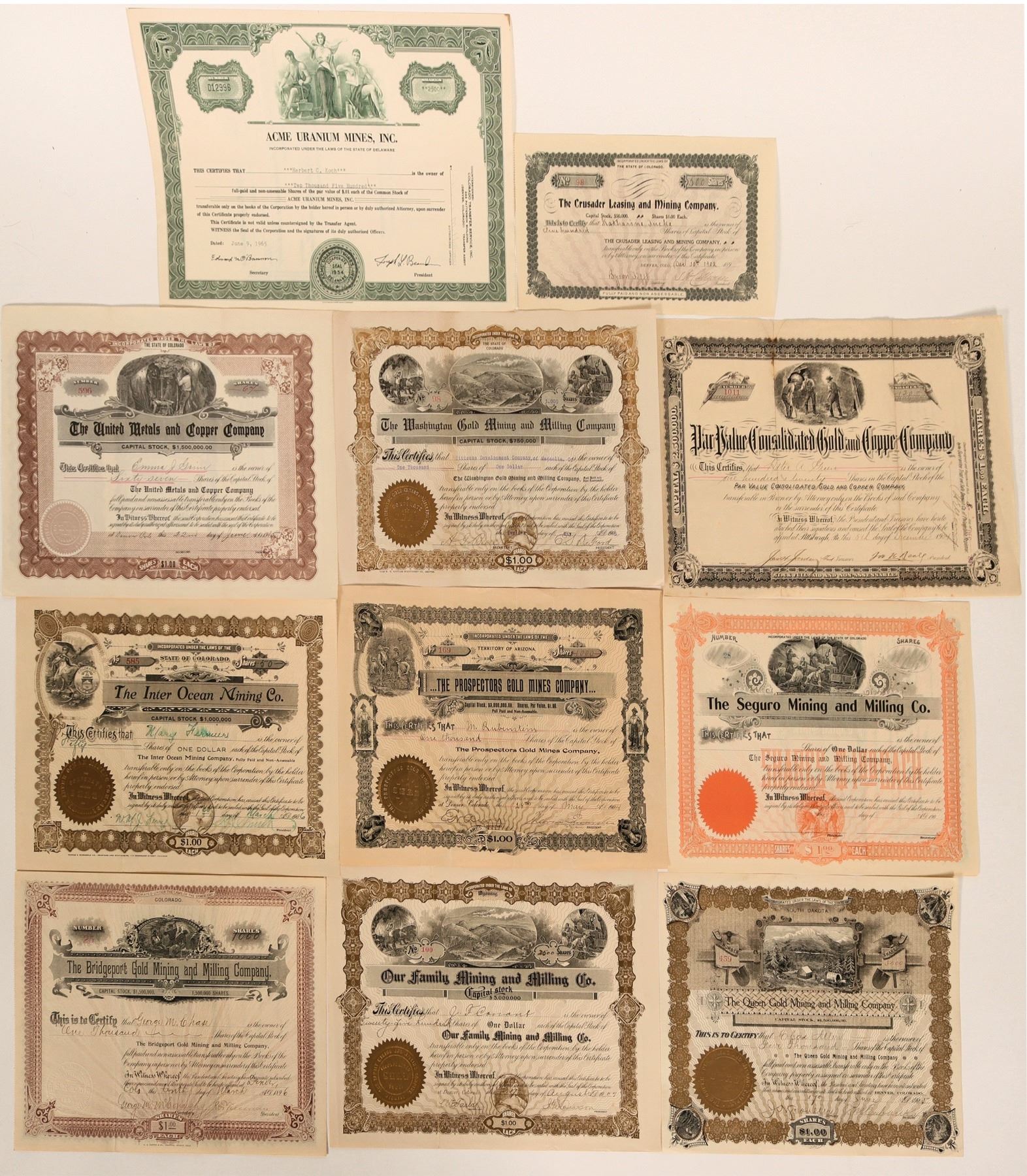 Queen Gold Mining and MIlling 1905, Family Mining and MIlling 1907, Bridgeport Gold Mining and Milling 1896 number 25, Crusader Leasing and Mining 1902 number 98, Seguro Mining and Milling unissued number 28, Prospectors Gold Mines 1904, Inner Ocean Mining 1906, Par Value Consolidated Gold and Copper 1904, Washington Gold MIning and Milling 1905 number 98, United Metals and Copper 1915, Acme Uranium 1965. State: Colorado City: Date: 1896-1965
