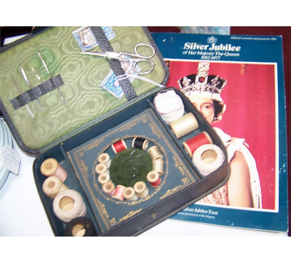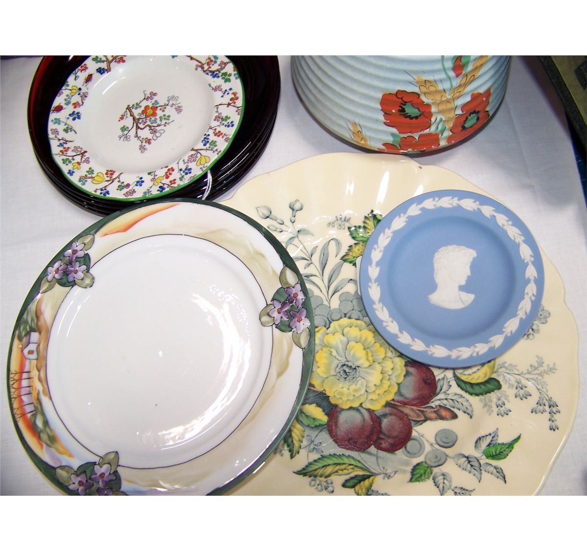 Including a Wedgwood plate, glass plates, old sewing box Copeland +.