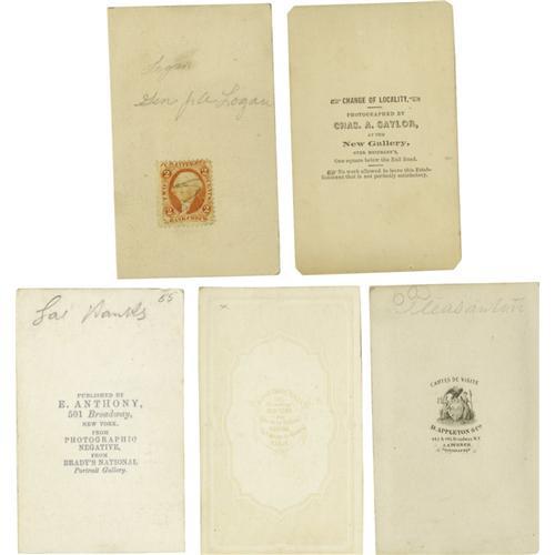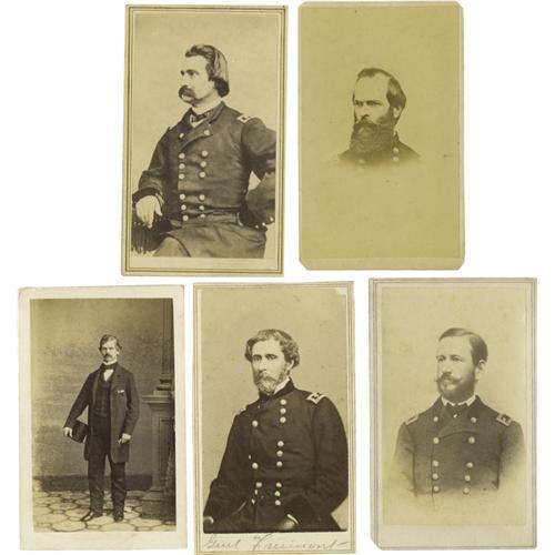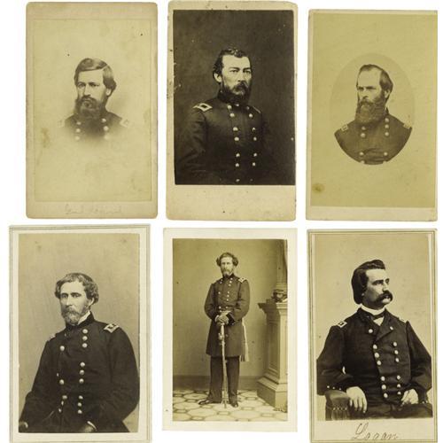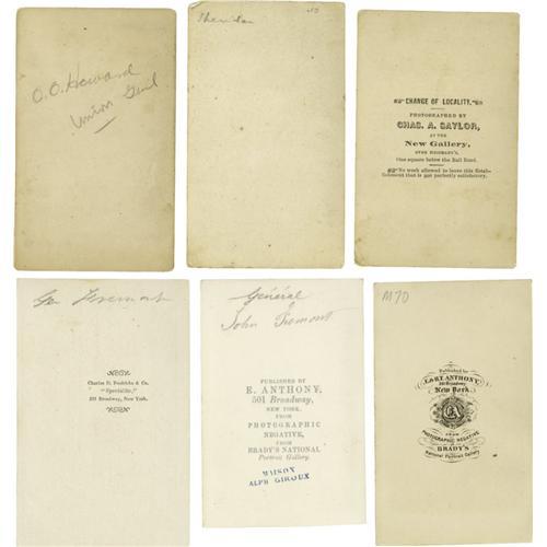 <B>Eleven Various Union Generals <I>Cartes de Visite</B></I>.</B></I> Included are: 3 - General John C. Fremont; 2 - General J.A. Logan; 3 - General O.O. Howard; 1- General Philip Sheridan; 1 - General Alfred Pleasonton; 1 - General Nathaniel Banks. All in fine condition or better; most have pencil notations on verso; light overall toning on most; Sheridan photo exhibits moderate edge wear; notations on recto of two. An excellent lot of generals; several quite uncommon.<BR><BR><b>Shipping:</b> Small Flat (<a target="_blank" href="http://www.heritageauctions.com/common/shipping.php">view shipping information</a>)