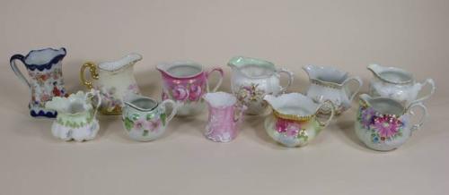 Eleven various floral pattern creamers including manufacturers from Germany, France, China, etc. Good Cond.