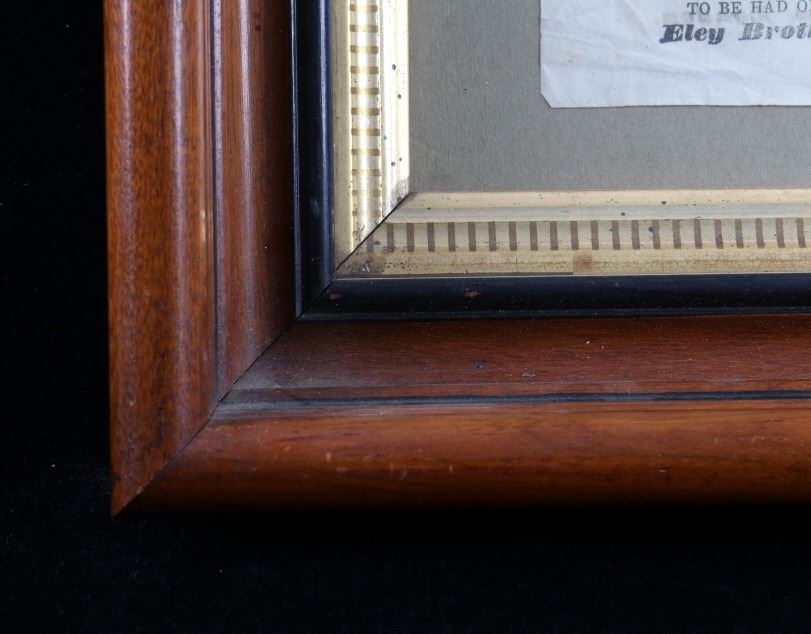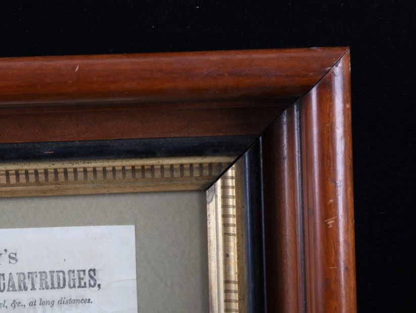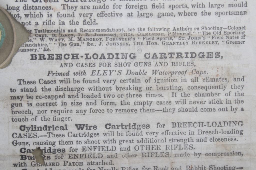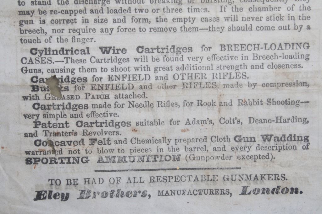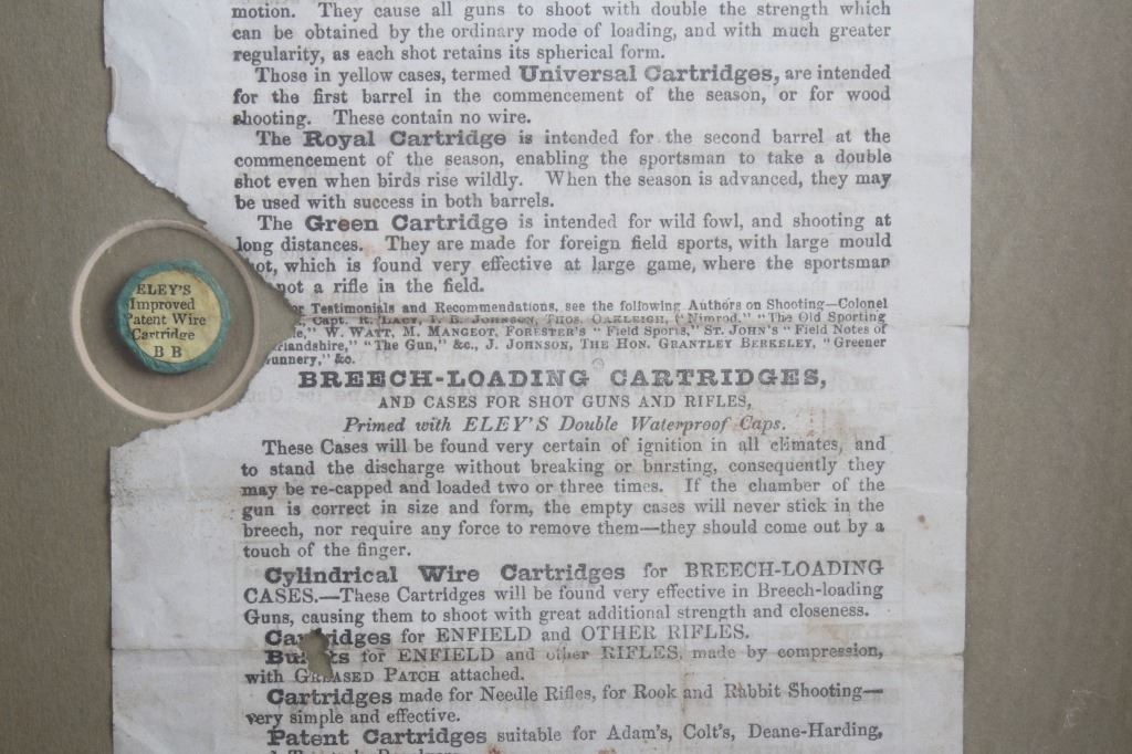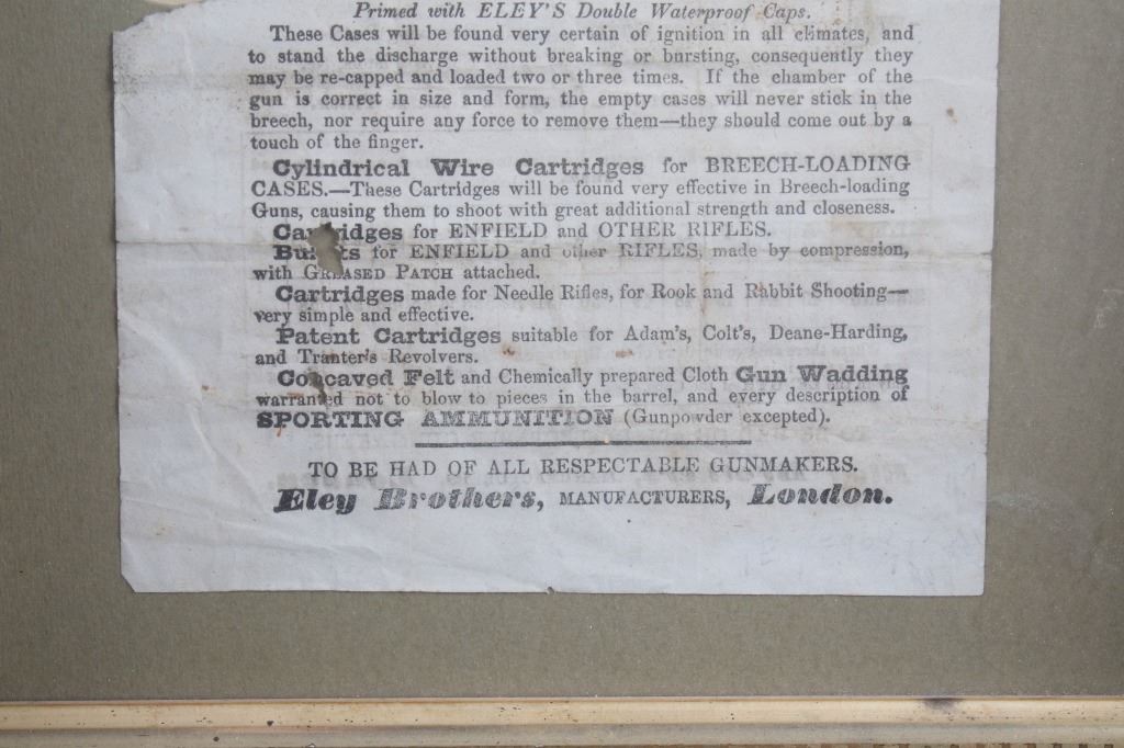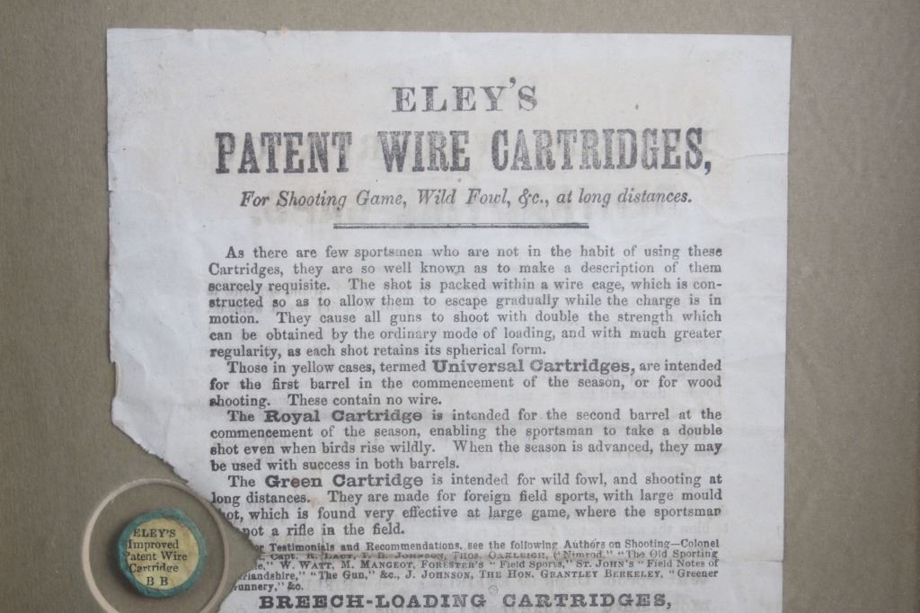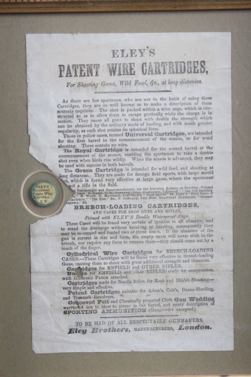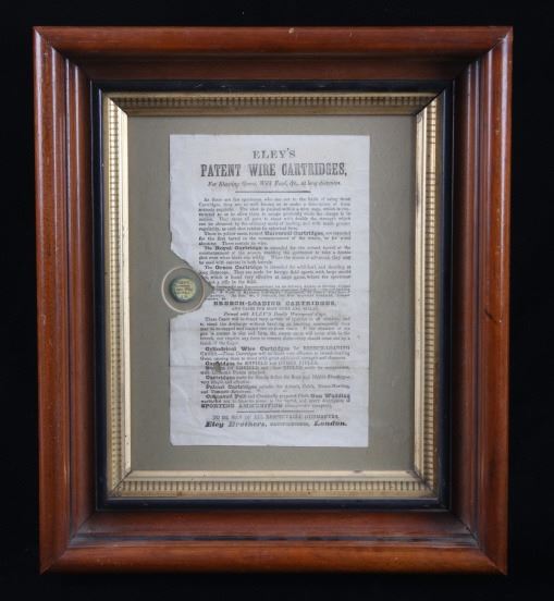 Available in this lot is a framed paper titled "Eley's Patent Wire Cartridges", originating from the early 1800's. Eley Brothers is a British ammunition manufacturing company founded in the 1820's by Charles and William Eley. The brothers purchased the patent right to the wire cartridge in 1828. The company is currently known for its accurate .22 caliber ammo. This piece shows information on the wire cartridges with information on seven kinds of breech loading cartridges. The piece shows an example of the cartridge on the left side. The piece is set into a custom frame with a tan border around the paper. It shows good condition overall, with some light wear across the paper and frame. The frame measures 14 1/2" tall by 12 1/4" wide with the paper measuring 5 1/2" wide by 8 1/2" tall.