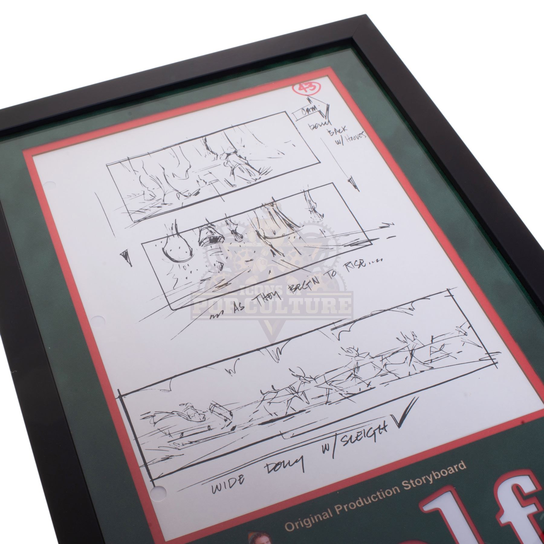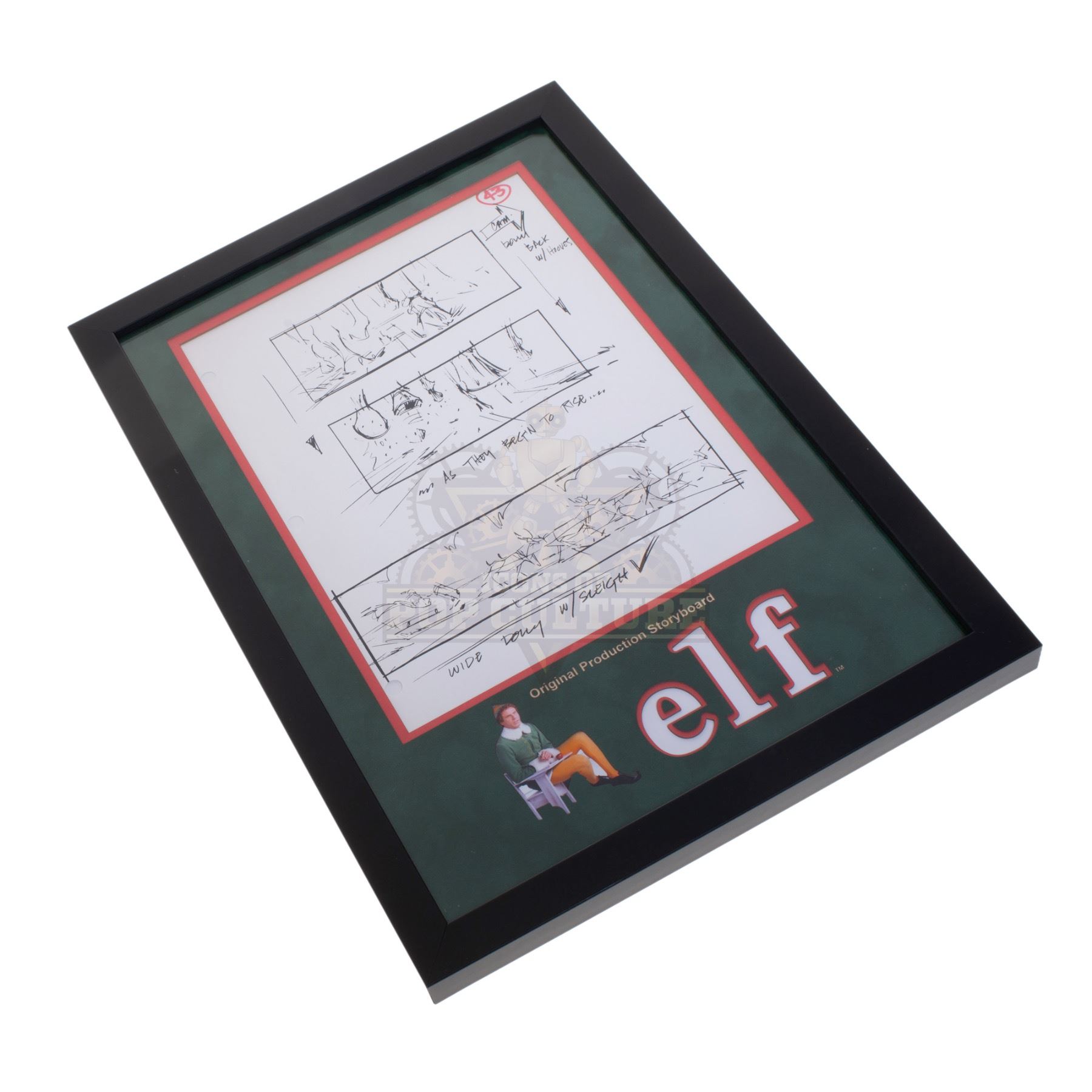 An original production used storyboard print featuring three panels of Santa taking off in his sleigh. The storyboard details the shot requirements of the scene and were used during the production. The page is displayed in a 16.75” x 12” black frame with red and green matting featuring the film’s logo and image of Will Ferrell as “Buddy”. This is not a hand-drawn page, but production used print.