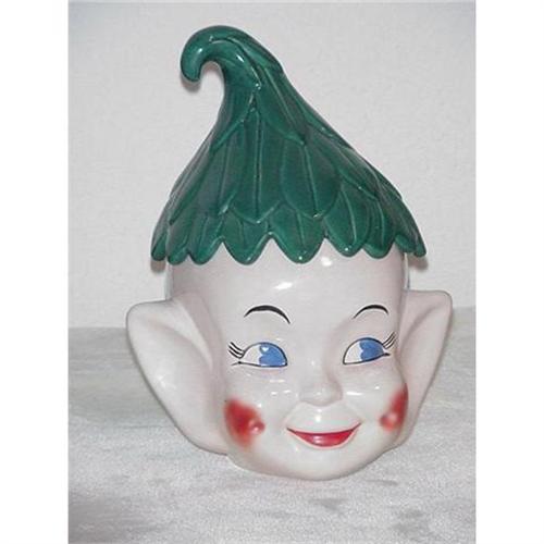 <table width="100%" border="0" cellspacing="0" cellpadding="4"><tr><td><em> </em></td></tr><tr> <td width="100%"> California Originals Manhattan Beach Ca. "Elf" cookie jar, 10 1/4" tall, 8 1/2" wide, green hat unmarked.