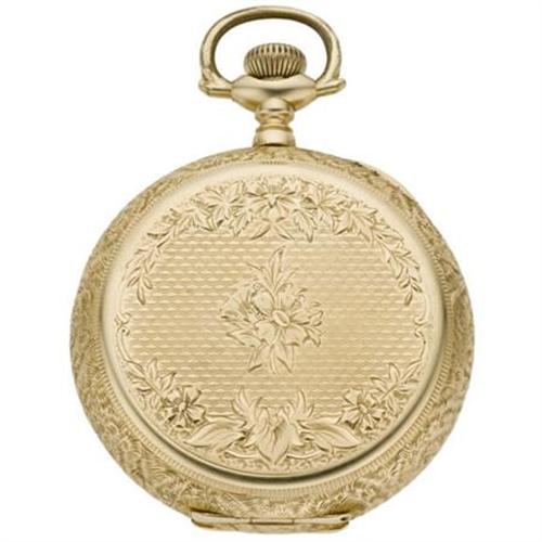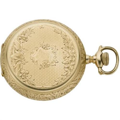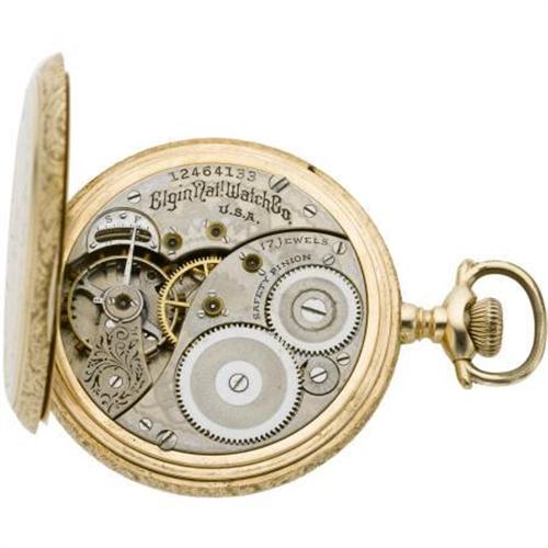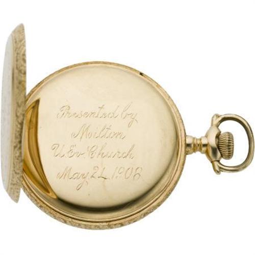 <B>Elgin Gold Hunters Case, circa 1908</B></I> Ornate case with leaf, flower and swirls. Initialed crest on front, inscription on inner cuvette. Arabic dial, red five minute numerals, spade hands. Fancy damaskeened 17 jewel nickel movement.<BR><BR><b>Shipping:</b> Miscellaneous Collectibles, Smal (<a target="_blank" href="http://www.heritageauctions.com/common/shipping.php">view shipping information</a>)