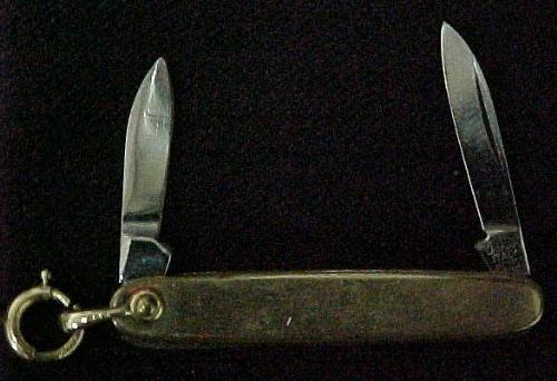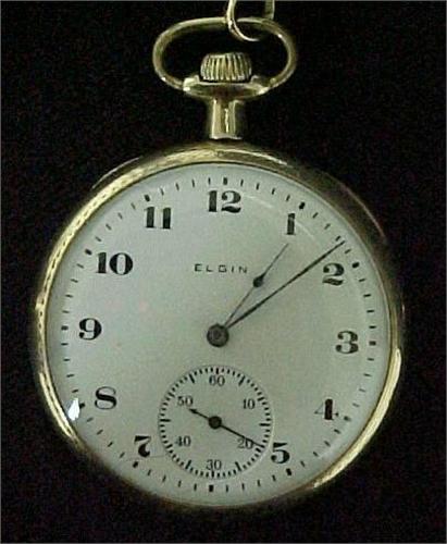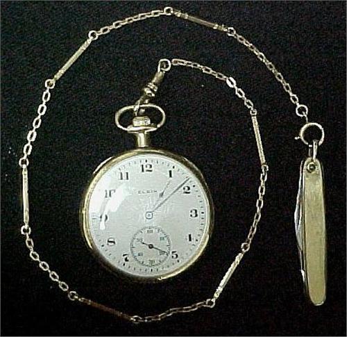 Elgin C. 1930 gold filled pocketwatch with chain and pen knife; 1 5/8" diameter; 13" chain with alternating links and bars; 2" pen knife has engine turned design on back with shield
