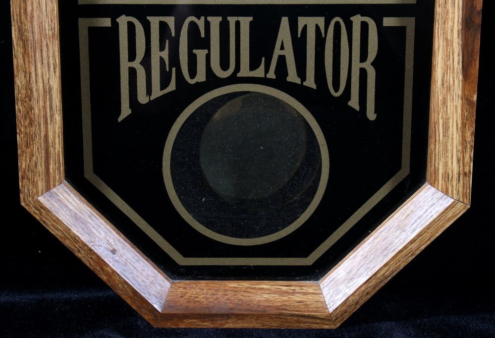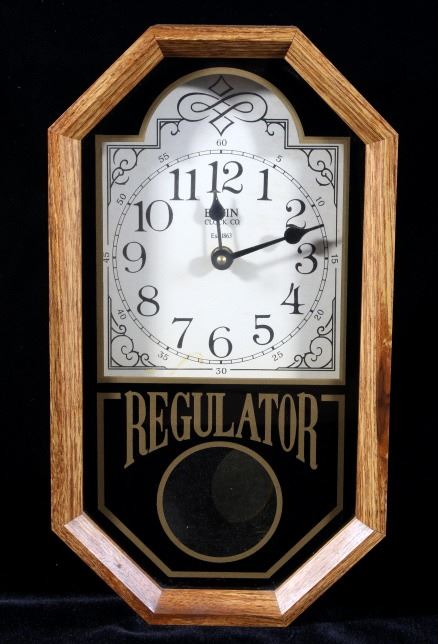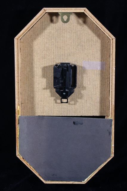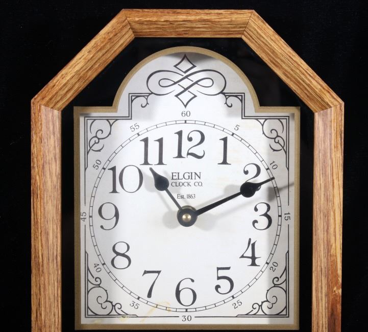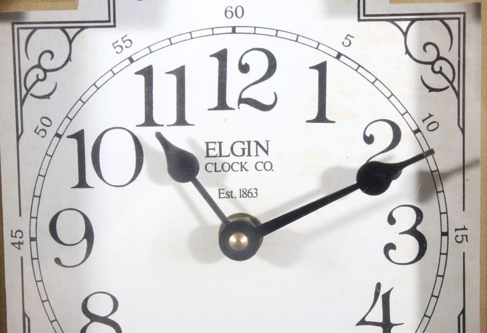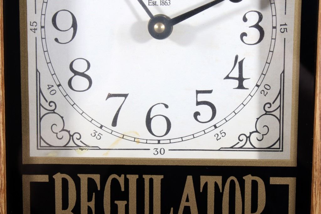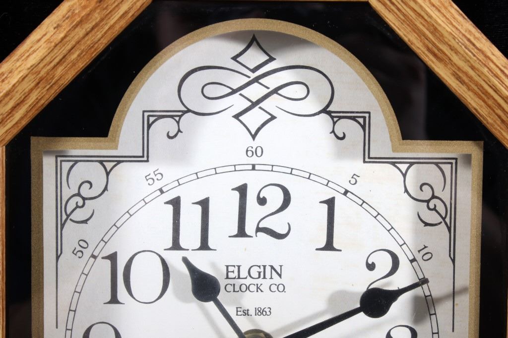 Included in this lot we have a Elgin Clock Co. regulator wall clock originating from the mid 20th century. The clock shows a oak veneer with a reverse glass painted front. The clock shows a paper clock face with detailed designs along the border. The clock face is marked reading "Elgin Clock Co. Est. 1863". with the front of the clock is marked with reverse glass painted "Regulator" painted in black and gold. The back of the clock is marked "Takane parts made in Japan assembled in Thailand" on the electric mechanics. The clock shows good condition overall with some light wear. The clock measures 16" tall by 9" wide.