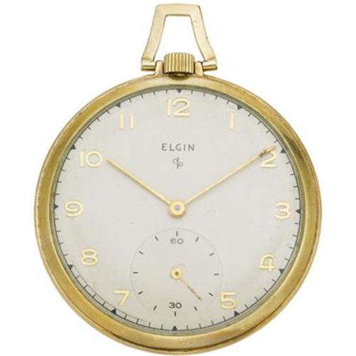 <B>Elgin Gold-Filled Openface Pocket Watch</B></I><BR><BR>Case: 45 mm, 10k yellow gold filled with high polish finish, marked "Cased and Timed by Elgin National Watch Company," 8217953 and 3217<BR>Dial: silvered with applied gold tone Arabic numerals, goldtone hour and minute hands, and mineral crystal<BR>Movement: 36 mm, 15 jewels, manual wind, Elgin 546 adjusted to 4, marked No. N42309<BR>Signed: Triple signed on case, movement, and dial<BR><BR><b>Shipping:</b> Miscellaneous Collectibles, Smal (<a target="_blank" href="http://www.heritageauctions.com/common/shipping.php">view shipping information</a>)