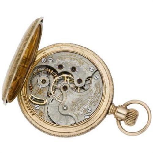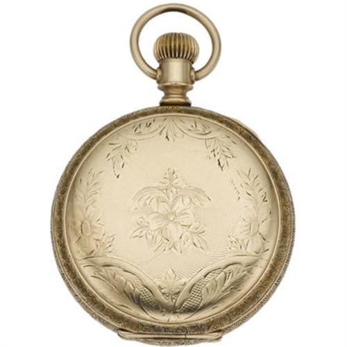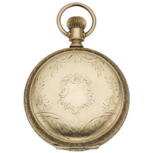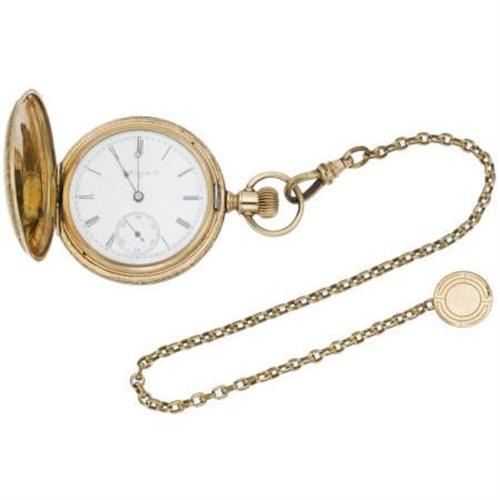 <B>Elgin Gold Hunting Case Pocket Watch with Chain</B></I><BR><BR>Case: 42 mm, hinged ornately decorated 14k yellow gold, reference #5099777, marked Fahys Montauk<BR>Dial: matte white with applied black roman numerals, black hour and minute markers, together with a sunken auxiliary with sweep seconds, signed Elgin<BR>Movement: 33 mm, 16 jewels, manual wind, No. 6577598, signed Elgin Watch Co. U.S.A.<BR>Signed: double signed on movement and dial<BR>Notes: accompanied by a 14k yellow gold-filled chain measuring 10 inches <B>Condition Report:</B> Good condition.<BR><BR><b>Shipping:</b> Miscellaneous Collectibles, Smal (<a target="_blank" href="http://www.heritageauctions.com/common/shipping.php">view shipping information</a>)