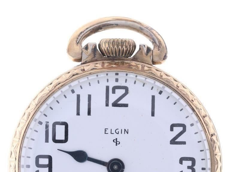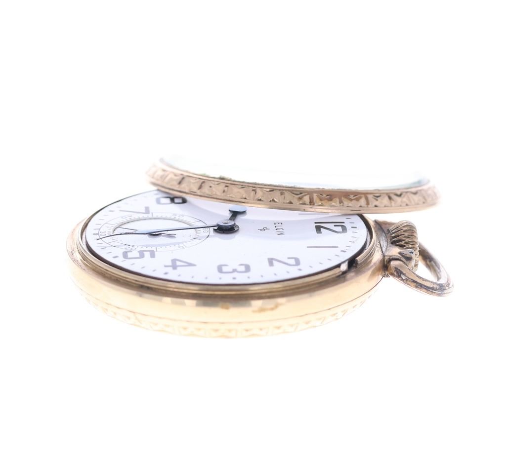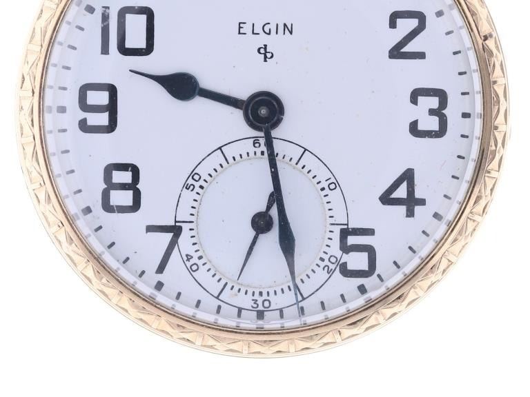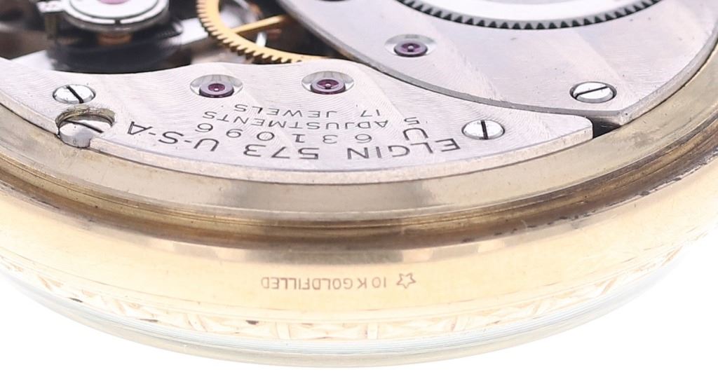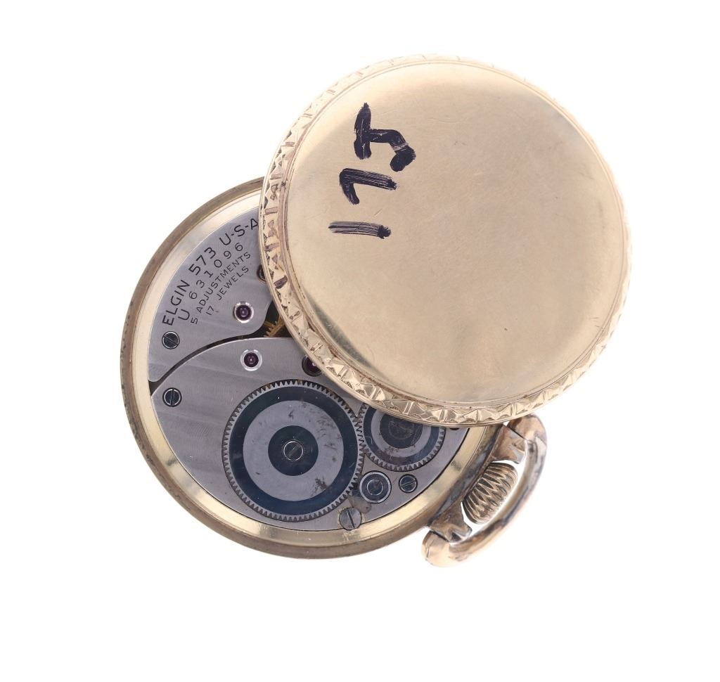 Featured in this lot is this 1947 Elgin Grade 573 pocket watch set in a Star Watch Case Company 10k gold filled case. In 1864, the Elgin National Watch Company was established in Elgin, Illinois, as an American watch manufacturer. The business was renowned for its innovation and accuracy, using cutting-edge manufacturing processes to create dependable timepieces. Initially, Elgin concentrated on making pocket watches because they were in high demand. Elgin watches were created in a variety of looks and patterns to suit different tastes and preferences. Elgin increased its operations and started making wristwatches as the demand for them increased in the late 19th and early 20th centuries. Sadly, in 1968 the Elgin National Watch Company stopped making watches, and in 1969 it was formally dissolved. The serial number inscribed alongside the movement is numbered, "U631096" indicating it was made in 1947. The pocket watch is a grade 573, 17 jewel, size 16s, model 20 and features a nickel movement finish and a 3/4 plate. This watch is not railroad graded. The watch is set in a 10k gold filled Star Watch case with the stamped serial number reading, "8542215". The watch shows good condition overall and is working order. No signs of obvious damage are noted. The watch measures 1 7/8" in diameter and a height of 2 1/8". The watch weighs 91.4 grams.