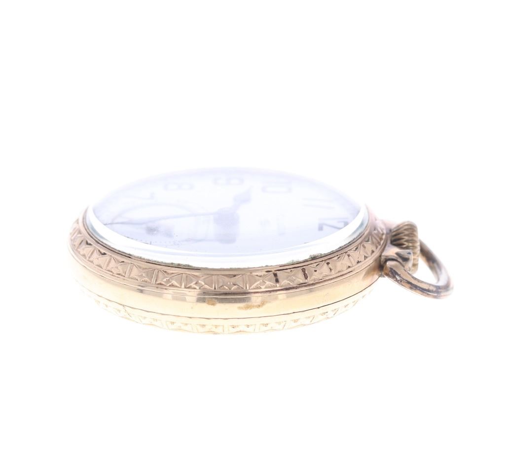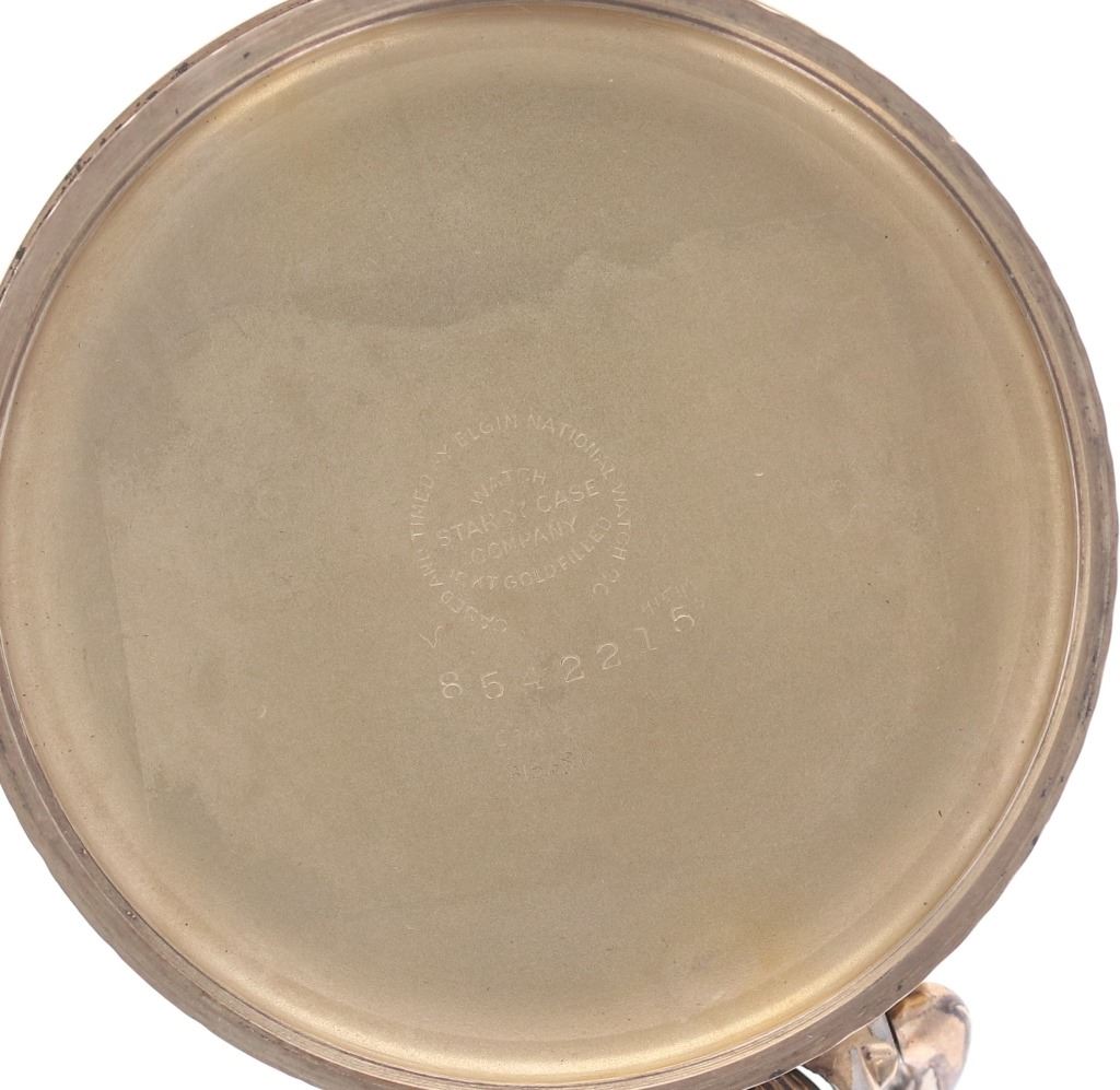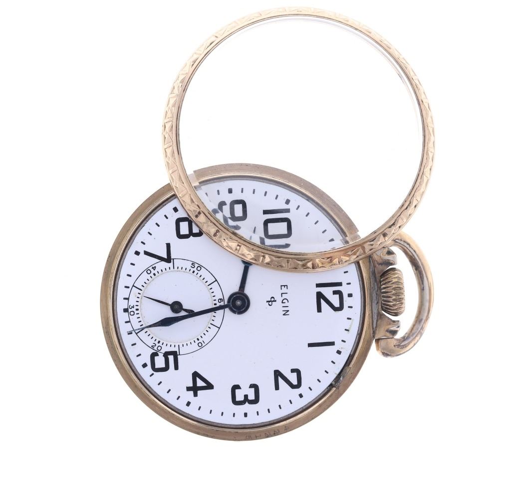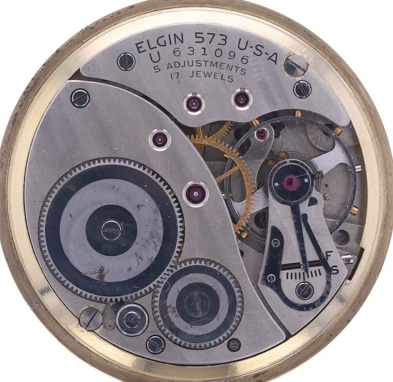Featured in this lot is this 1947 Elgin Grade 573 pocket watch set in a Star Watch Case Company 10k gold filled case. In 1864, the Elgin National Watch Company was established in Elgin, Illinois, as an American watch manufacturer. The business was renowned for its innovation and accuracy, using cutting-edge manufacturing processes to create dependable timepieces. Initially, Elgin concentrated on making pocket watches because they were in high demand. Elgin watches were created in a variety of looks and patterns to suit different tastes and preferences. Elgin increased its operations and started making wristwatches as the demand for them increased in the late 19th and early 20th centuries. Sadly, in 1968 the Elgin National Watch Company stopped making watches, and in 1969 it was formally dissolved. The serial number inscribed alongside the movement is numbered, "U631096" indicating it was made in 1947. The pocket watch is a grade 573, 17 jewel, size 16s, model 20 and features a nickel movement finish and a 3/4 plate. This watch is not railroad graded. The watch is set in a 10k gold filled Star Watch case with the stamped serial number reading, "8542215". The watch shows good condition overall and is working order. No signs of obvious damage are noted. The watch measures 1 7/8" in diameter and a height of 2 1/8". The watch weighs 91.4 grams.