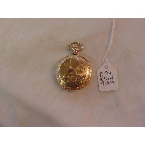 Serial # 9850042, Elgin National Watch, 15 Jewels, hunting case, good running condition, guaranteed to wear permanently and appears to be 14K yellow gold, about a 6 or 8 size, birds are flying in a floral scrolled design, monogram of MP, mint condition to the porcelain face with black roman numbers around the face and a recessed second hand. If you ever wanted a truly nice pocket watch, here is your chance.