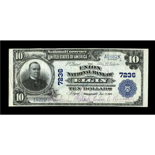 <B>Elgin, IL</B></I> - $10 1902 Plain Back Fr. 624 <B>The Union NB</B></I> Ch. # 7236<BR>Embossing and light handling are found on this $10 with purple stamped signatures. <B>Very Fine.</B></I><BR><BR><b>Shipping:</b> Coin/Currency (<a target="_blank" href="http://www.heritageauctions.com/common/shipping.php">view shipping information</a>)