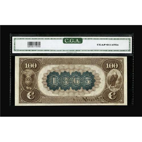<B>Elgin, IL</B></I> - $100 1882 Brown Back Fr. 526 <B>The First NB</B></I> Ch. # (M)1365<BR>A hugely margined example which has an impeccable pedigree, coming from the Henry Scheuermann collection, which we sold back in January of 2001. It is a beautiful $100 Brown Back which is perfect for type, and which has been encapsulated and graded as <B>Gem Uncirculated 65</B></I> by CGA. Expect to see bidding easily reach and perhaps well exceed...<BR><I>From The Lincoln Collection</B></I><BR><BR><b>Shipping:</b> Coins & Currency (<a target="_blank" href="http://www.heritageauctions.com/common/shipping.php">view shipping information</a>)