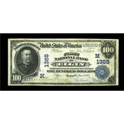 <B>Elgin, IL</B></I> - $100 1902 Date Back Fr. 689 <B>The First NB</B></I> Ch. # (M)1365<BR>A nice high denomination example from this well collected Kane County location. Evenly circulated dual color pen signed <B>Fine-Very Fine,</B></I> considerably closer to the higher rather than the lower grade.<BR><I>From The Lincoln Collection</B></I><BR><BR><b>Shipping:</b> Coins & Currency (<a target="_blank" href="http://www.heritageauctions.com/common/shipping.php">view shipping information</a>)