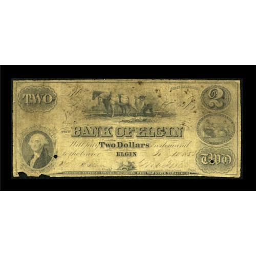 <B>Elgin, IL- Bank of Elgin</B></I> $2 G4a<BR> An extremely rare Illinois note from a bank where every note save for one $1 example is listed as SENC in Haxby. <B>Very Good,</B></I> a bit dark, with two small punch holes and a couple of small pieces missing near the bottom left margin. <BR><BR><b>Shipping:</b> Coins & Currency (<a target="_blank" href="http://www.heritageauctions.com/common/shipping.php">view shipping information</a>)