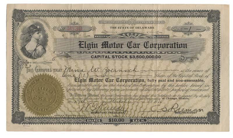 1916, Illinois. Stock certificate for 1 share. Black\Bold. Liberty head vignette. Litho. The company founded by several executives of the Elgin Watch Company who took control of the assets of the defunct New Era Motor Car Company. They operated from 1916 – 1923 in Argo, Illinois and from 1923 – 1924 in Indianapolis, Indiana. The company operated successfully for a period of time but was heavily affected by the post-war recession, entering receivership in June of 1924. Uncancelled and Very Fine.